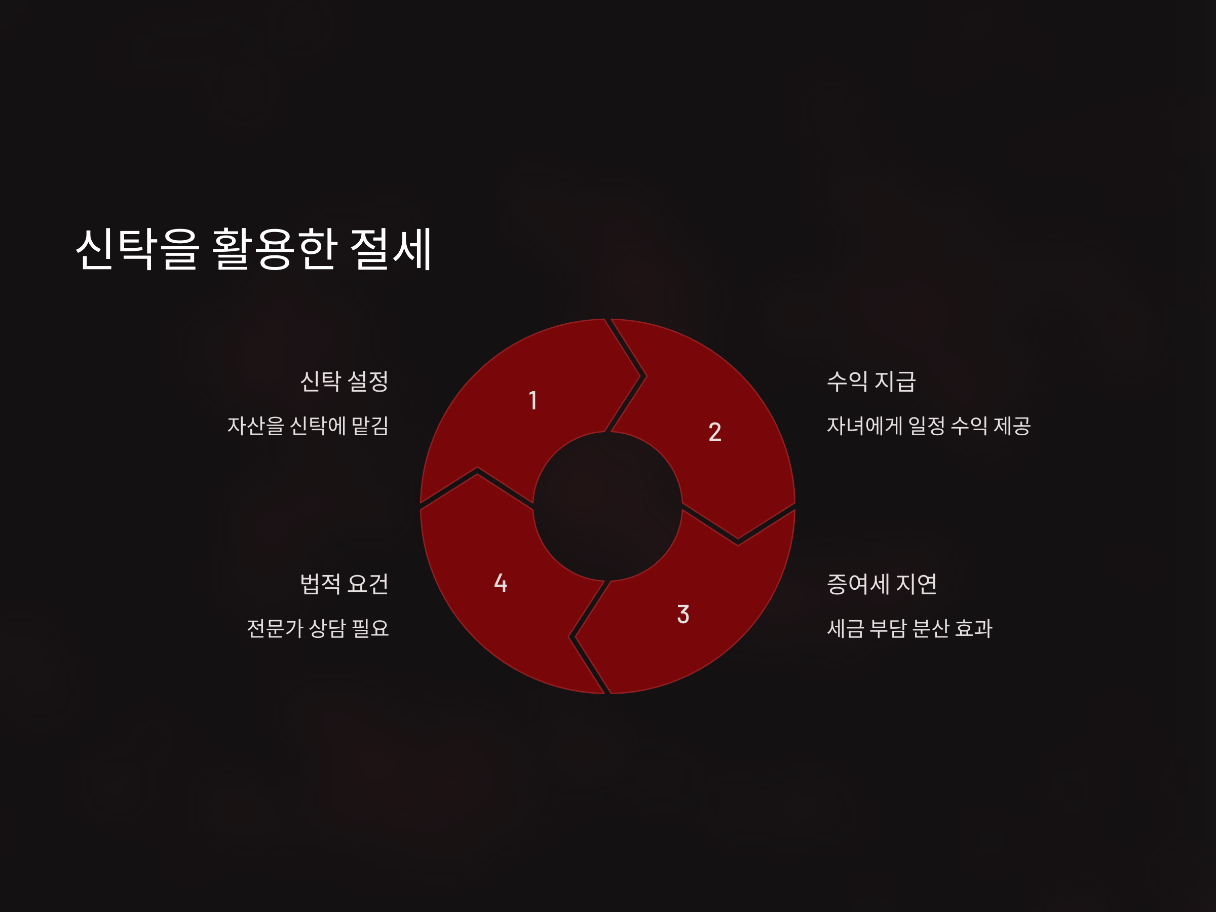 - 신탁 활용: 부모가 자산을 신탁에 맡기고, 자녀에게 일정 수익을 주는 방식으로 증여세를 지연시킬 수 있습니다. 이 방법은 증여세 부담을 분할하여 나누는 효과를 가질 수 있습니다.