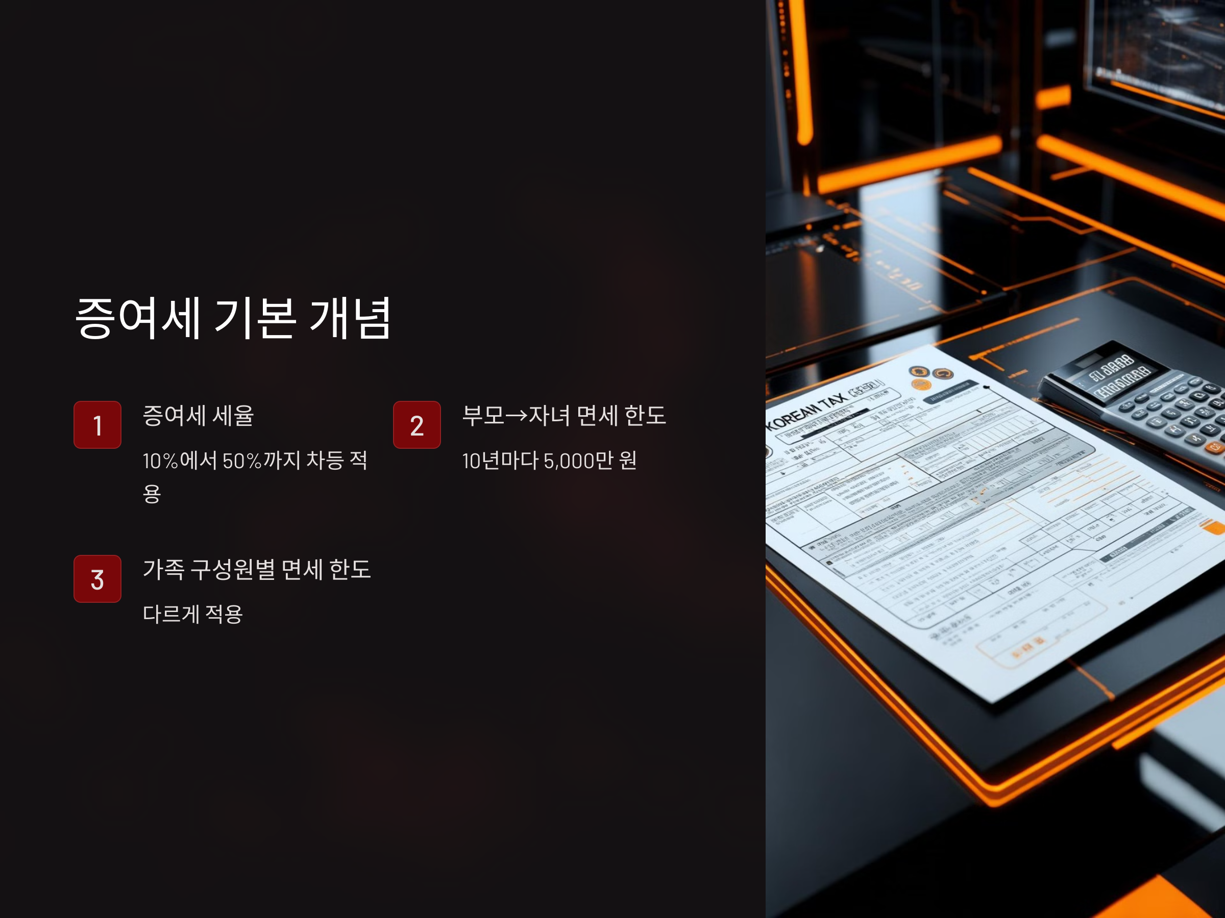 증여세는 자산을 증여받은 자에게 부과되는 세금으로, 증여 받은 자산의 가액이 일정 금액을 초과하면 세금이 발생합니다. 한국의 경우, 증여세의 세율은 10%에서 50%까지 차등 적용됩니다. 자녀에게 증여할 경우, 부모가 증여할 수 있는 금액에 대해 법적으로 정해진 면세 한도가 존재합니다.