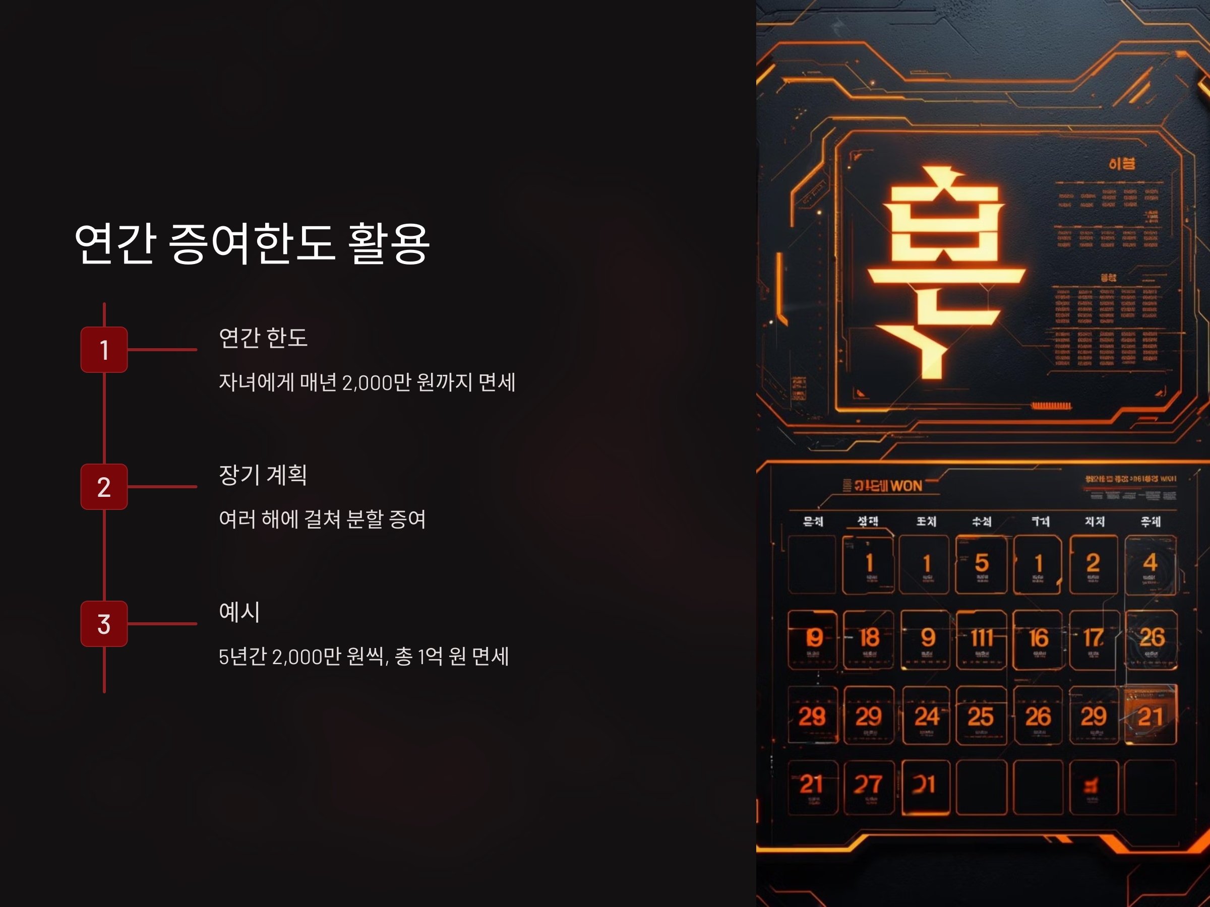 자녀에게 증여할 때 가장 중요한 절세 포인트는 연간 증여 한도를 활용하는 것입니다. 매년 2,000만 원까지 증여세가 부과되지 않기 때문에, 이를 최대한 활용하면 큰 세금 부담을 줄일 수 있습니다.