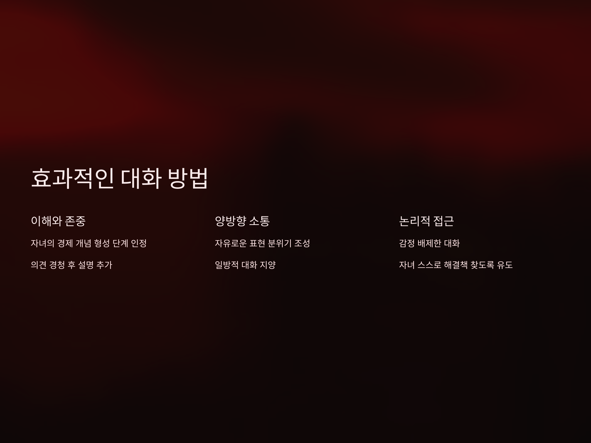 자녀와의 대화에서 가장 중요한 점은 이해와 존중입니다. 자녀가 아직 충분히 경제적 개념을 형성하지 못했다면, 부모가 이를 강요하거나 억지로 이해시키려는 태도를 취해서는 안 됩니다. 자녀가 돈을 어떻게 사용하고 관리하는지에 대한 의견을 충분히 들은 후, 부모는 자신의 경험과 지식을 바탕으로 설명을 추가하는 방식이 효과적입니다. 또한, 대화가 일방적이지 않도록 하여 자녀가 자신의 생각을 자유롭게 표현할 수 있는 분위기를 만드는 것이 중요합니다.