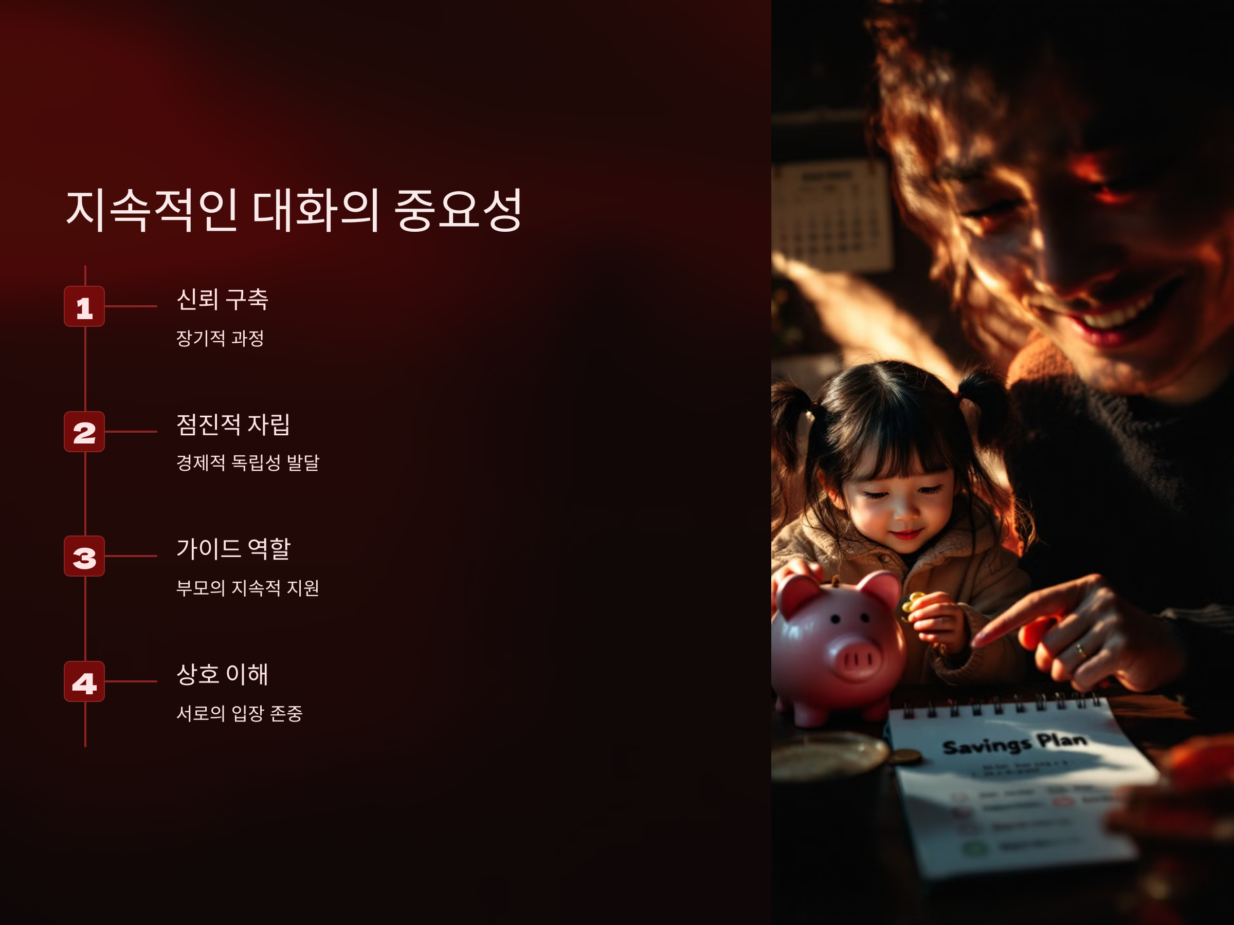 돈 문제에 대해 대화할 때, 부모는 자녀에게 단순히 이론을 전달하는 것에 그치지 않고, 직접적인 모델링을 통해 자녀에게 좋은 본보기를 보여줘야 합니다. 부모가 돈을 어떻게 관리하고, 저축을 어떻게 하는지, 그리고 소비를 어떻게 계획하는지 자녀는 매우 민감하게 관찰하고 배우게 됩니다. 따라서 부모는 자신이 자녀에게 가르치는 것과 일치하는 행동을 해야만 자녀는 자연스럽게 이를 따라하게 됩니다.
