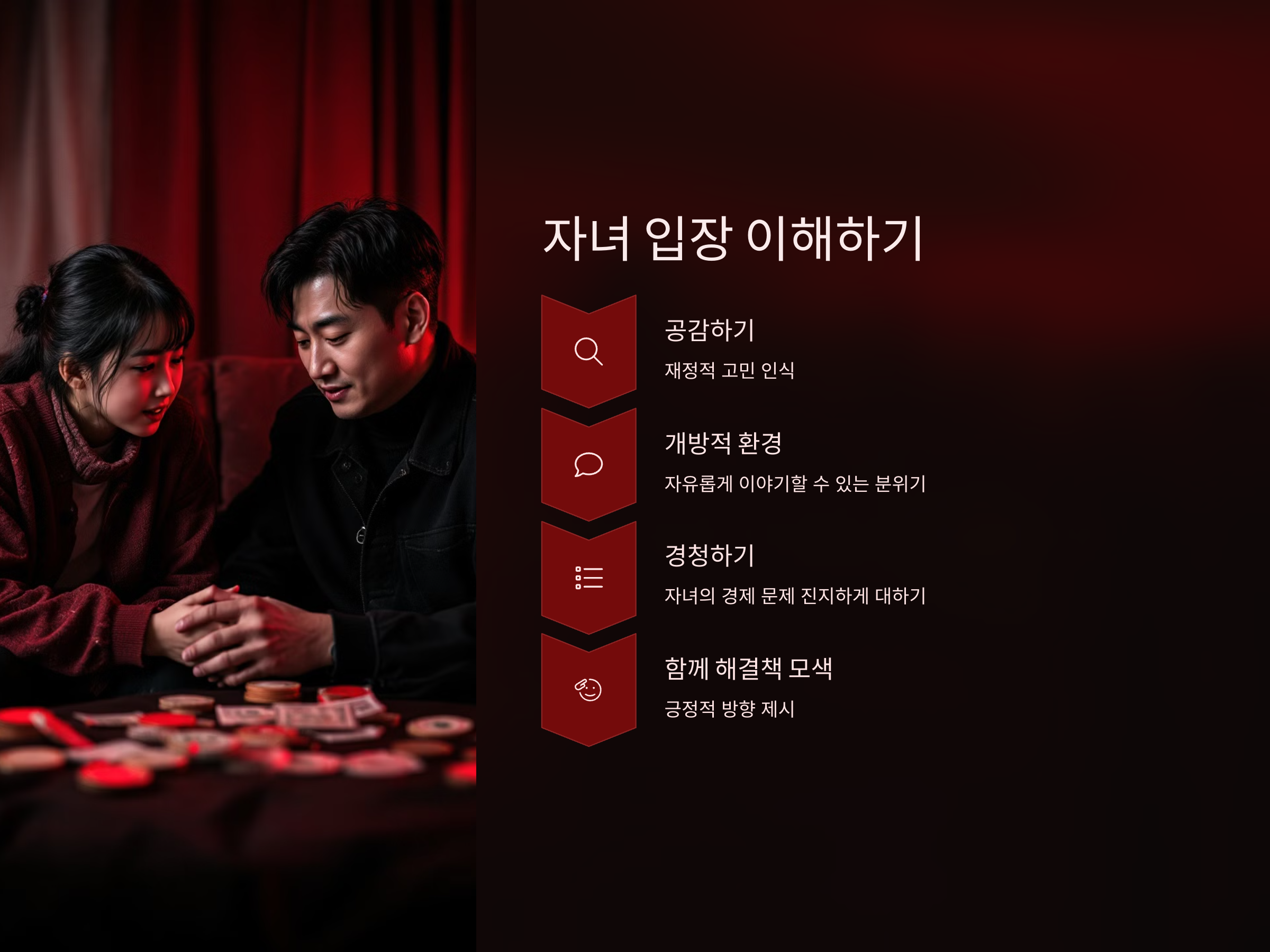 부모는 자녀의 경제적 문제를 가볍게 여기지 않고, 충분히 경청하고 이해하려는 태도를 보여야 합니다. 자녀가 문제를 공유하면, 부모는 문제의 해결책을 함께 고민하며 자녀가 긍정적인 방향으로 나아갈 수 있도록 돕는 것이 중요합니다.