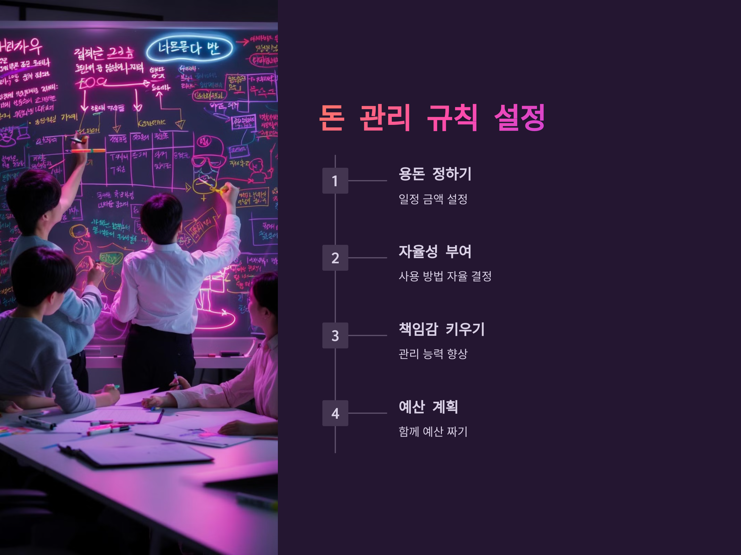 자녀와 함께 예산을 짜고, 돈을 어떻게 관리할 것인지 계획을 세우는 과정에서 자녀는 자연스럽게 돈을 다루는 능력을 키울 수 있습니다. 이 과정에서 부모는 자녀에게 돈에 대한 책임감과 의사결정 능력을 길러주는 역할을 하게 됩니다.
