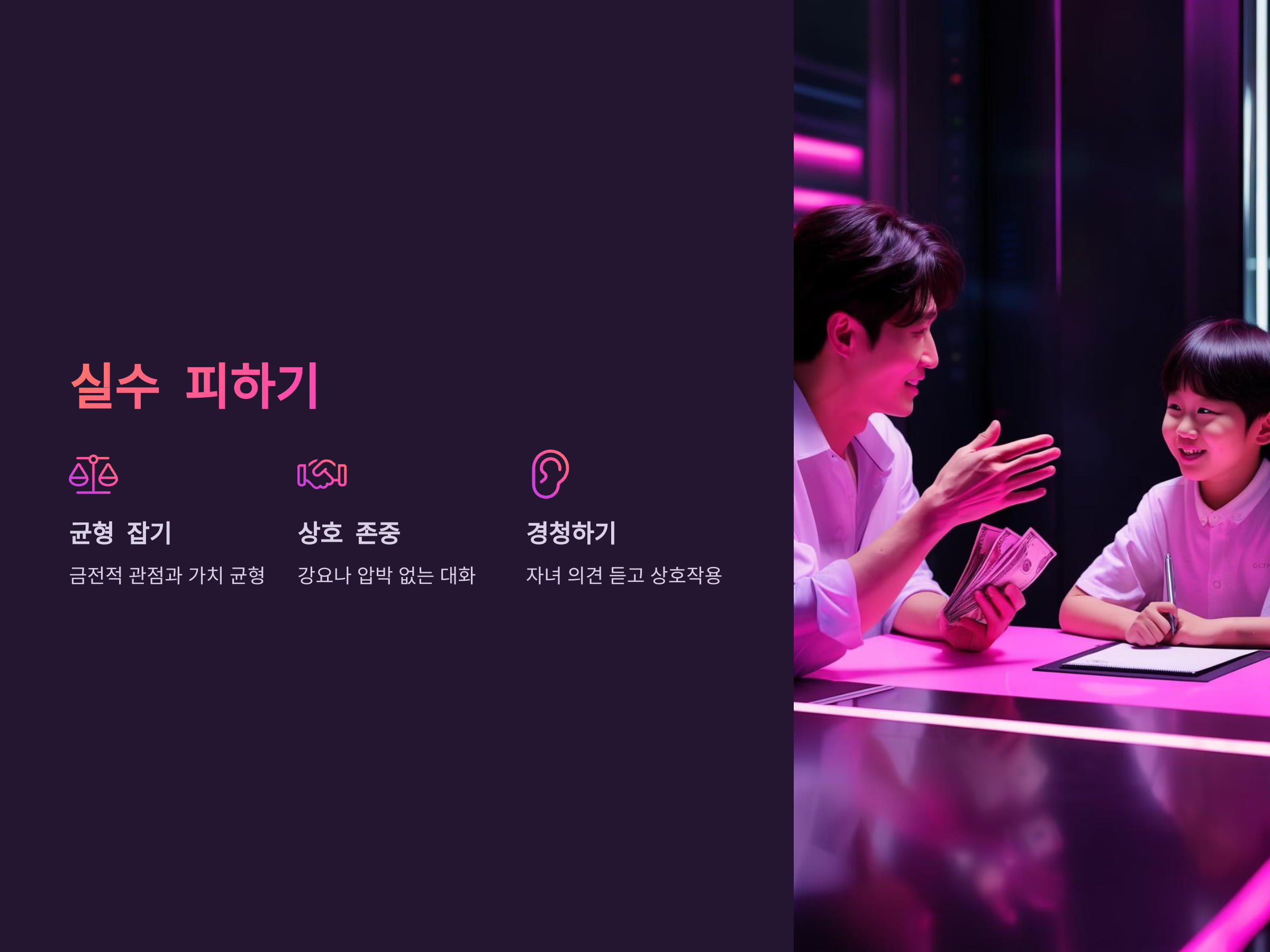 자녀와 돈 문제를 대화할 때, 몇 가지 실수는 피해야 합니다. 첫째, 돈에 대해 지나치게 금전적인 관점만을 강조하는 것은 좋지 않습니다. 돈의 가치를 알려주는 것이 중요하지만, 그보다 더 중요한 것은 돈을 사용하는 태도와 관리하는 능력입니다. 둘째, 부모가 자녀에게 지나치게 강요하거나 압박을 가하는 태도는 갈등을 유발할 수 있습니다. 대화는 항상 상호 존중의 기반 위에서 이루어져야 합니다.