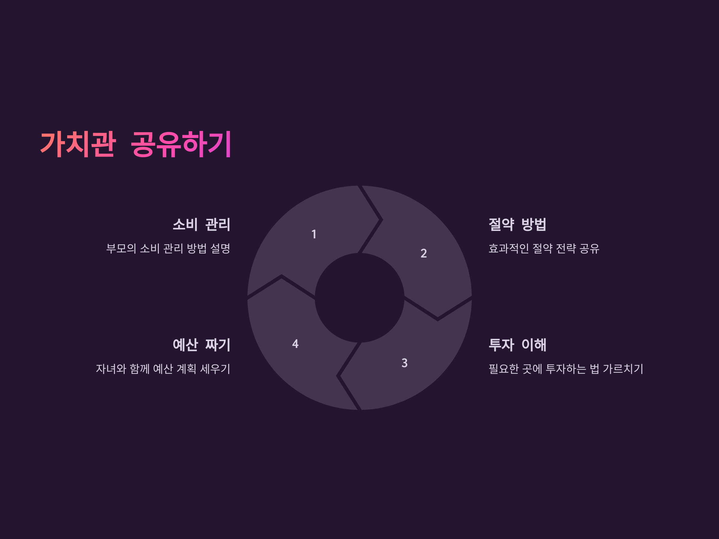 자녀에게 돈의 가치를 가르치는 가장 좋은 방법은 부모가 자신만의 가치관을 공유하는 것입니다. 돈이 단지 물질적인 것만을 의미하는 것이 아니라, 그것을 어떻게 잘 사용하는지가 중요함을 알려주어야 합니다. 예를 들어, 부모가 자신의 소비를 어떻게 관리하고, 절약하며, 필요한 곳에 투자하는지를 자녀에게 설명해주는 것은 좋은 방법입니다.