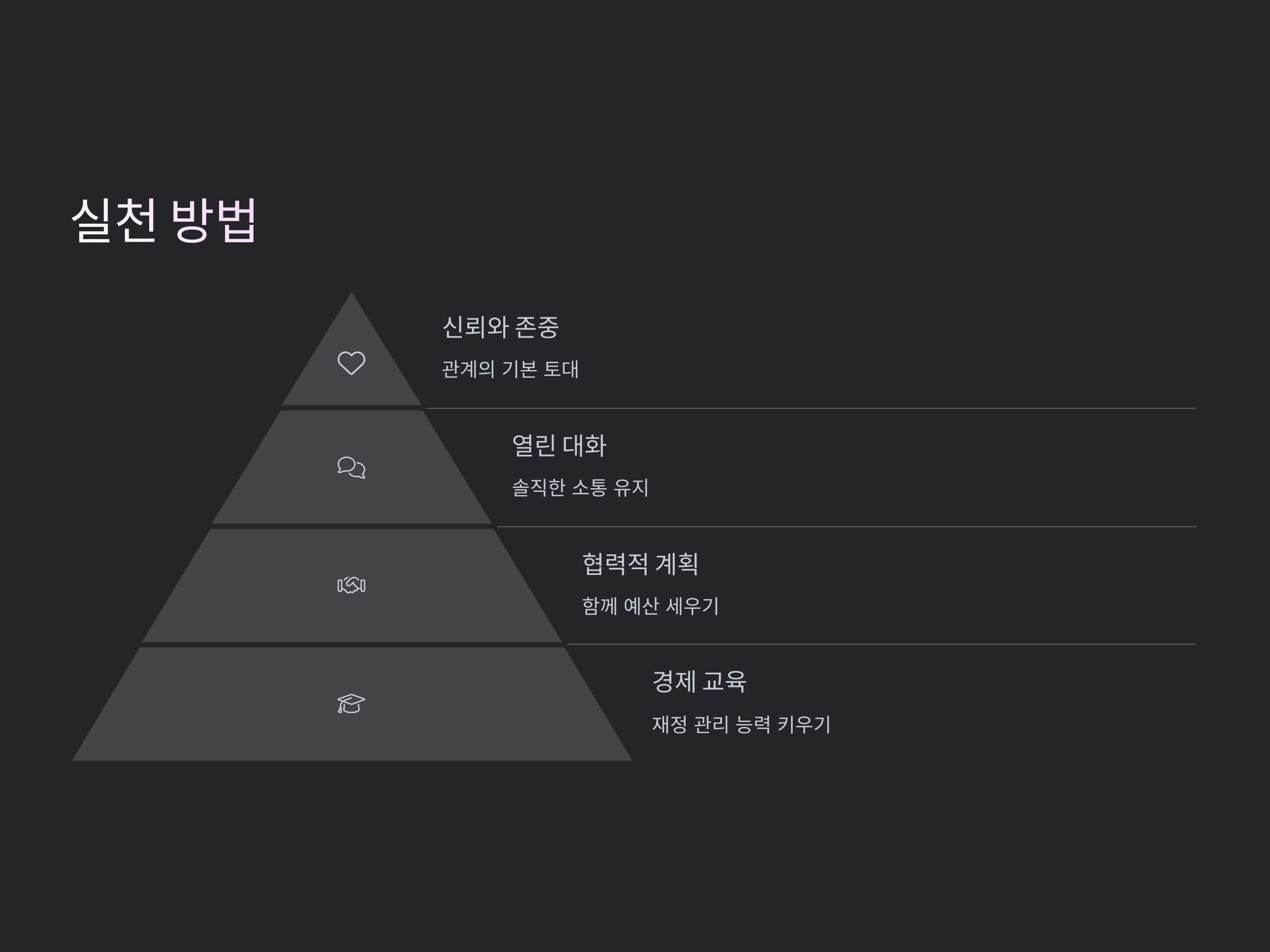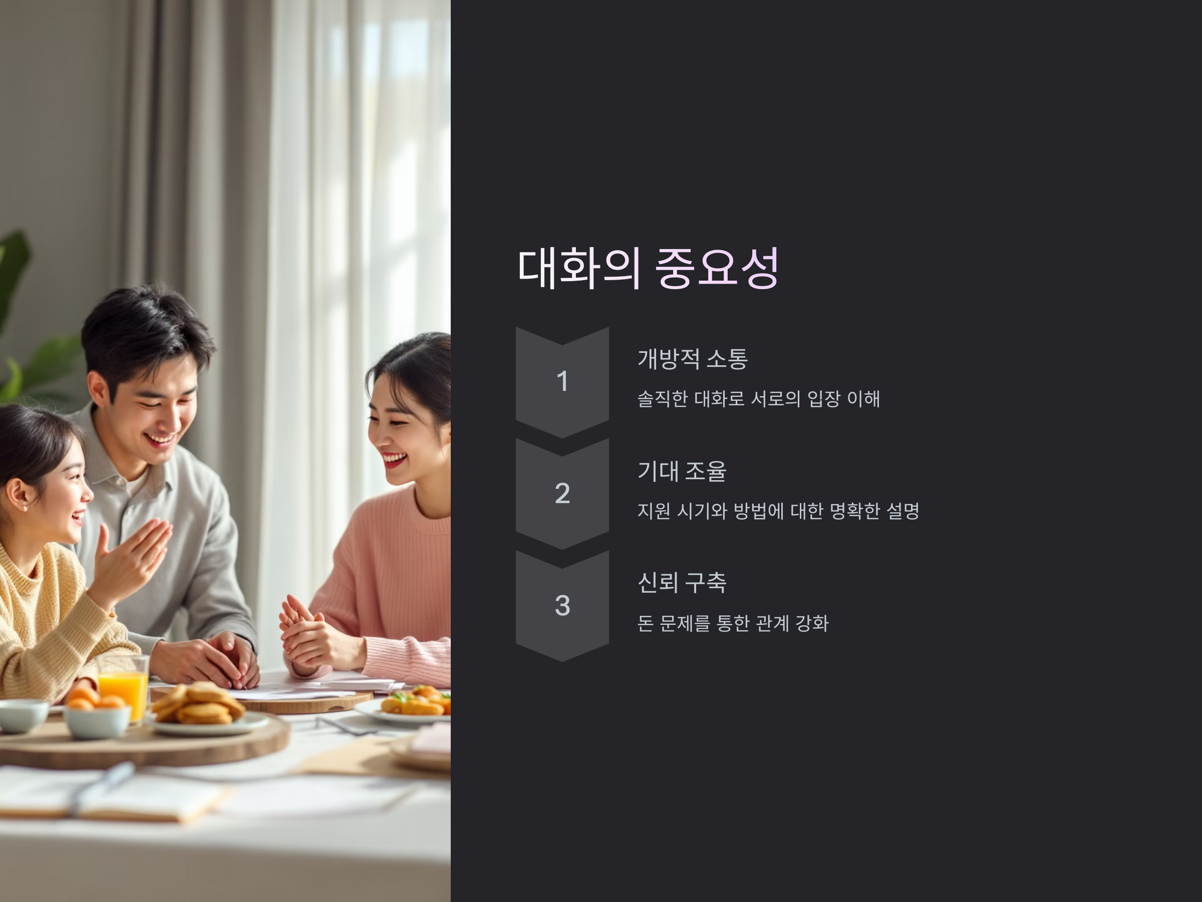 부모와 자녀 간의 대화에서 중요한 점은, 돈 문제를 단순한 거래가 아니라 가정 내에서 신뢰를 쌓는 중요한 요소로 다룬다는 것입니다. 경제적인 문제는 단순히 물질적인 것이 아니라, 부모와 자녀 간의 관계를 강화하거나 약화시킬 수 있는 중요한 요소이기도 합니다. 따라서, 돈 문제에 대한 대화를 통해 서로의 기대를 조율하고, 서로를 이해하려는 노력이 필요합니다.