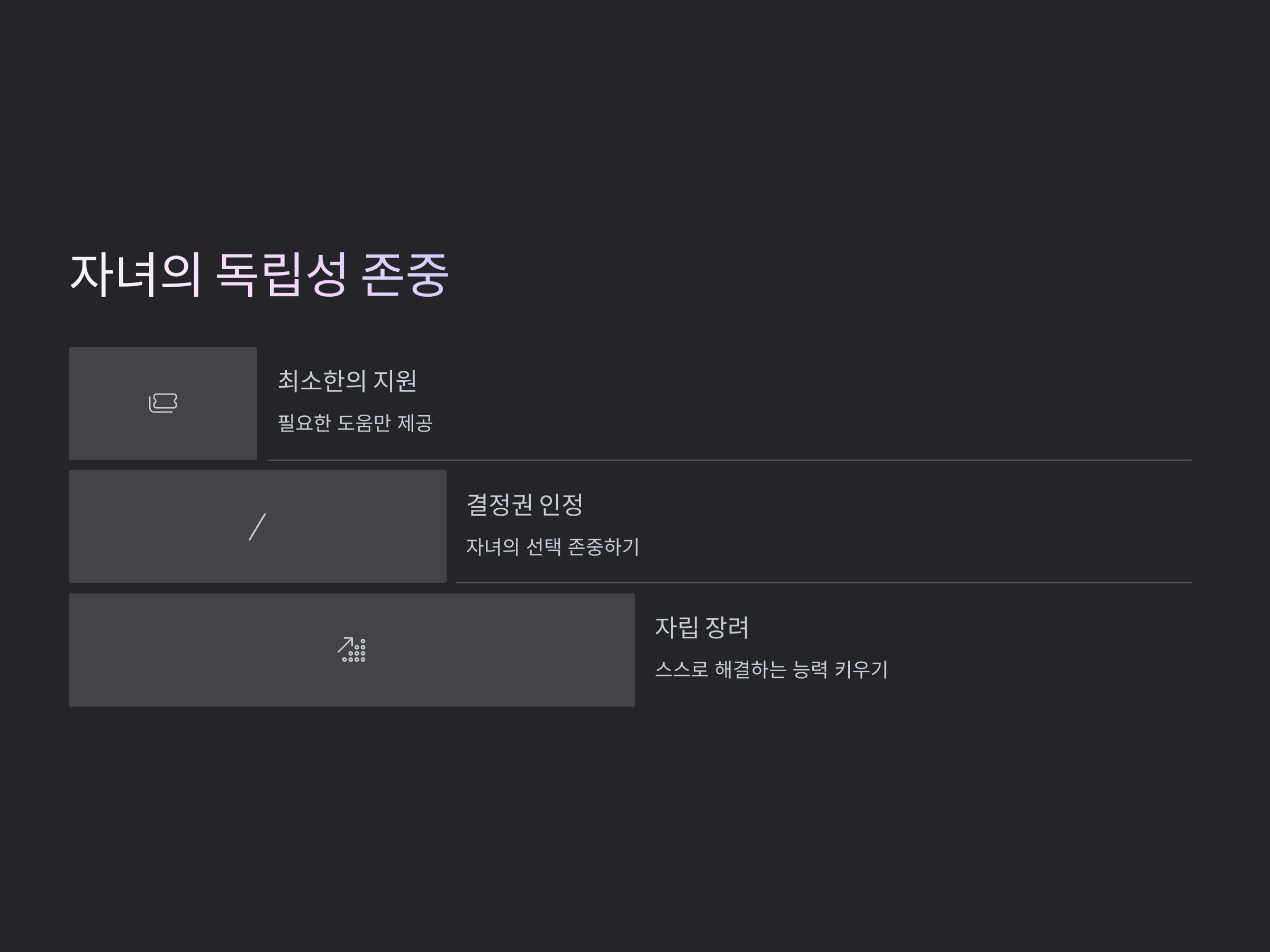 부모는 자녀가 독립을 위한 준비가 되어 있는지 살펴보고, 그들의 독립적인 결정을 존중해 주어야 합니다. 자녀가 독립적인 삶을 시작할 때 부모는 최소한의 경제적 지원을 제공하되, 자녀가 스스로 생활할 수 있도록 돕는 것이 중요합니다. 부모의 지원을 받으며 독립을 준비하는 자녀에게는 경제적 자립을 위한 구체적인 계획을 세우는 것도 좋은 방법입니다.
