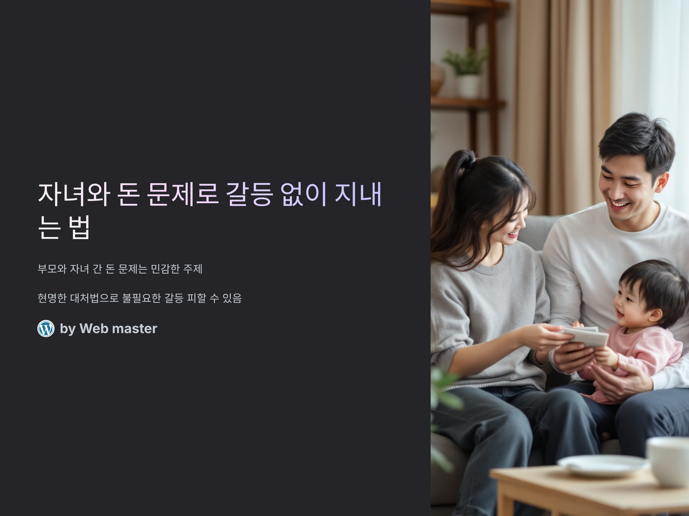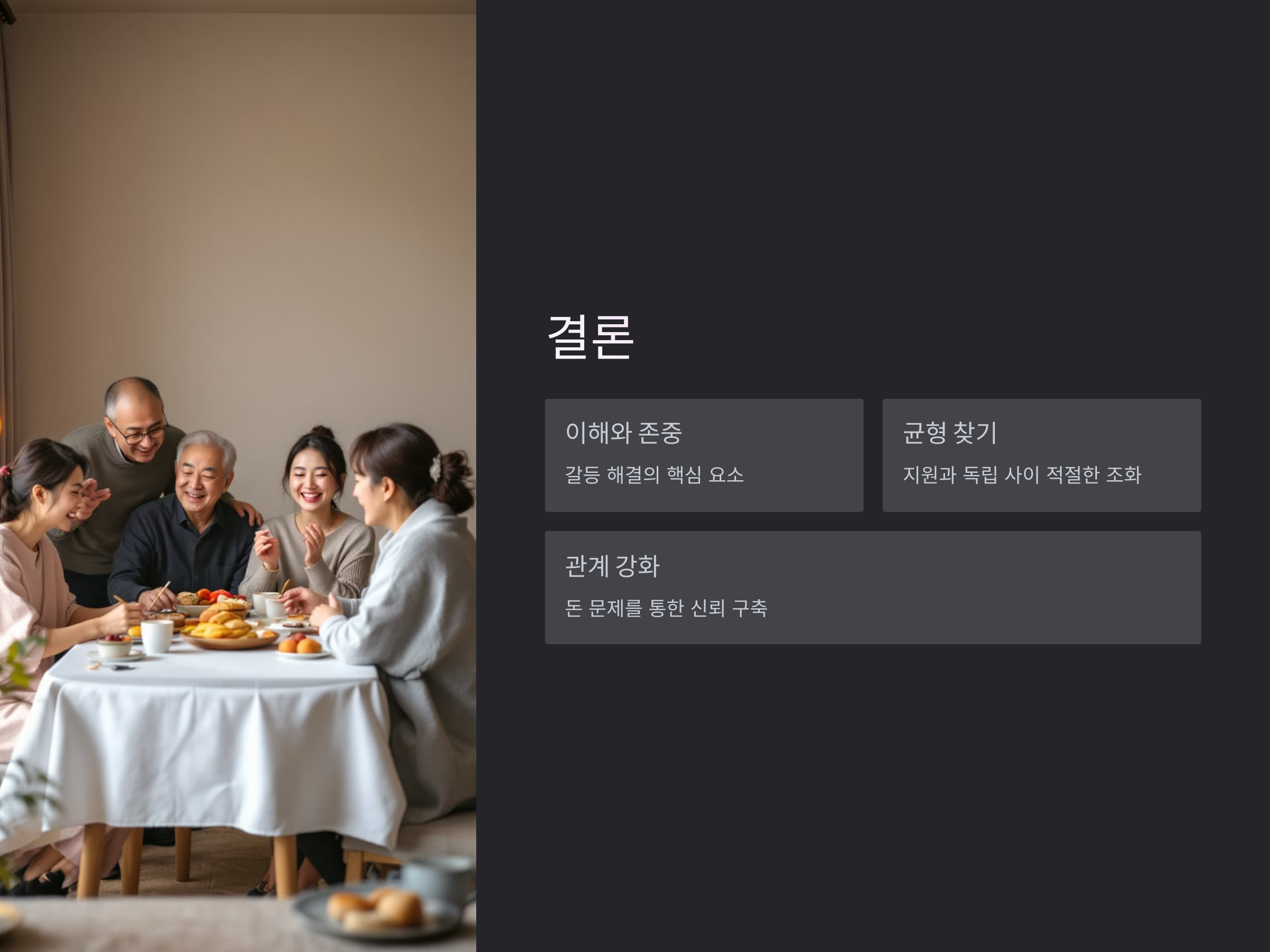 자녀와 돈 문제로 갈등 없이 지내는 법은 결국 서로의 이해와 존중에 있습니다. 부모는 자녀에게 경제적 지원을 제공하는 동시에 자녀의 독립적인 결정을 존중하며, 자녀는 부모의 가르침을 바탕으로 경제적 자립을 위한 노력을 기울여야 합니다. 돈 문제에 대한 개방적인 대화와 협력적인 관계 유지를 통해, 갈등을 예방하고 가정 내에서 서로의 신뢰를 쌓을 수 있습니다. 부모와 자녀 간의 돈 문제는 단순한 물질적 문제가 아니라, 서로를 이해하고 존중하는 관계의 중요한 요소임을 잊지 말아야 합니다.