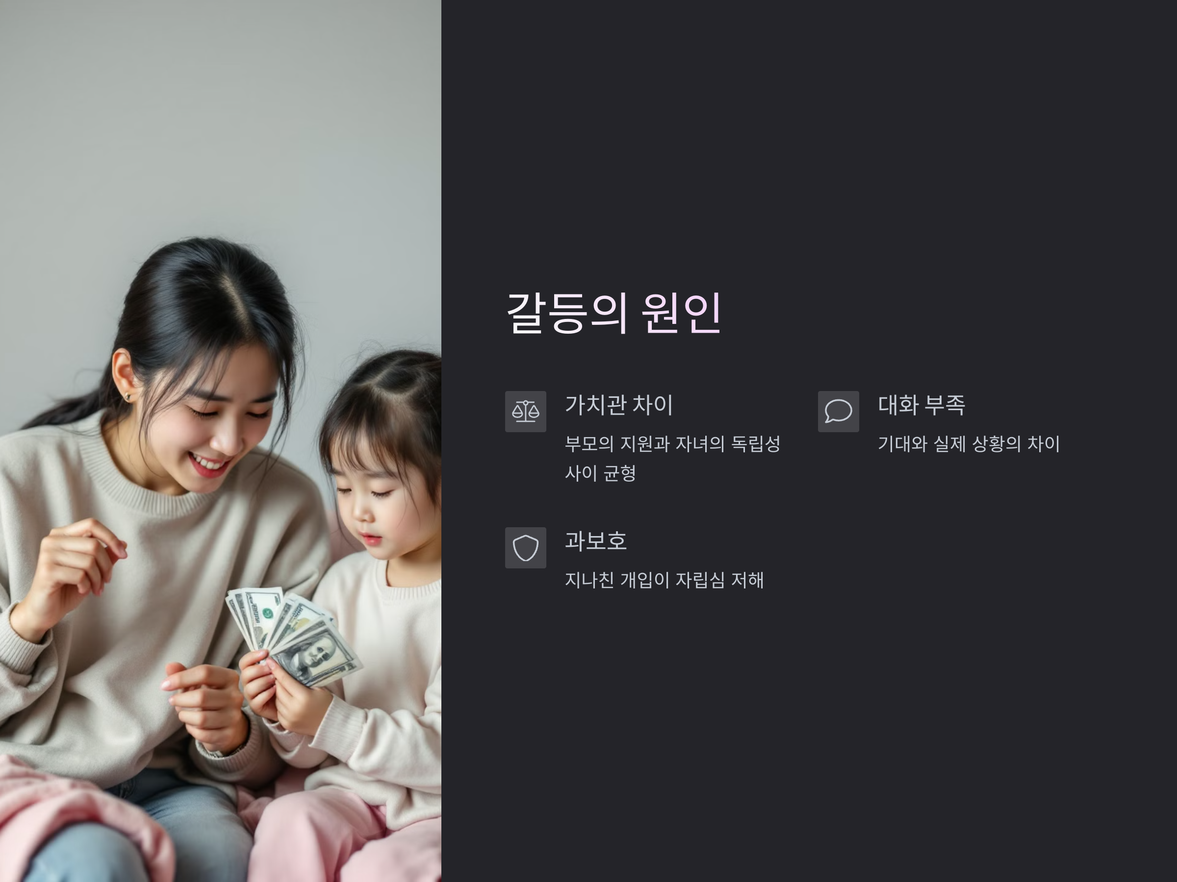 세 번째로는 부모의 지나치게 보호적인 태도나 자녀의 경제적 자립에 대한 무관심이 갈등의 원인으로 작용할 수 있습니다. 부모가 지나치게 개입하거나 자녀가 독립적인 삶을 추구하지 않으면, 돈에 대한 불만이 커지기 쉽습니다.
