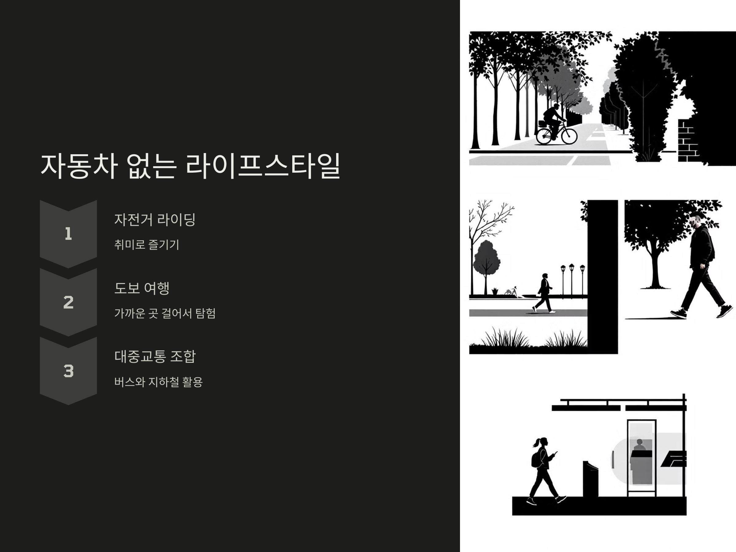 자동차 없이도 충분히 편리하고 자유로운 생활이 가능합니다. 중요한 것은 자신의 생활 패턴에 맞는 교통수단을 선택하고, 이를 적극적으로 활용하는 것입니