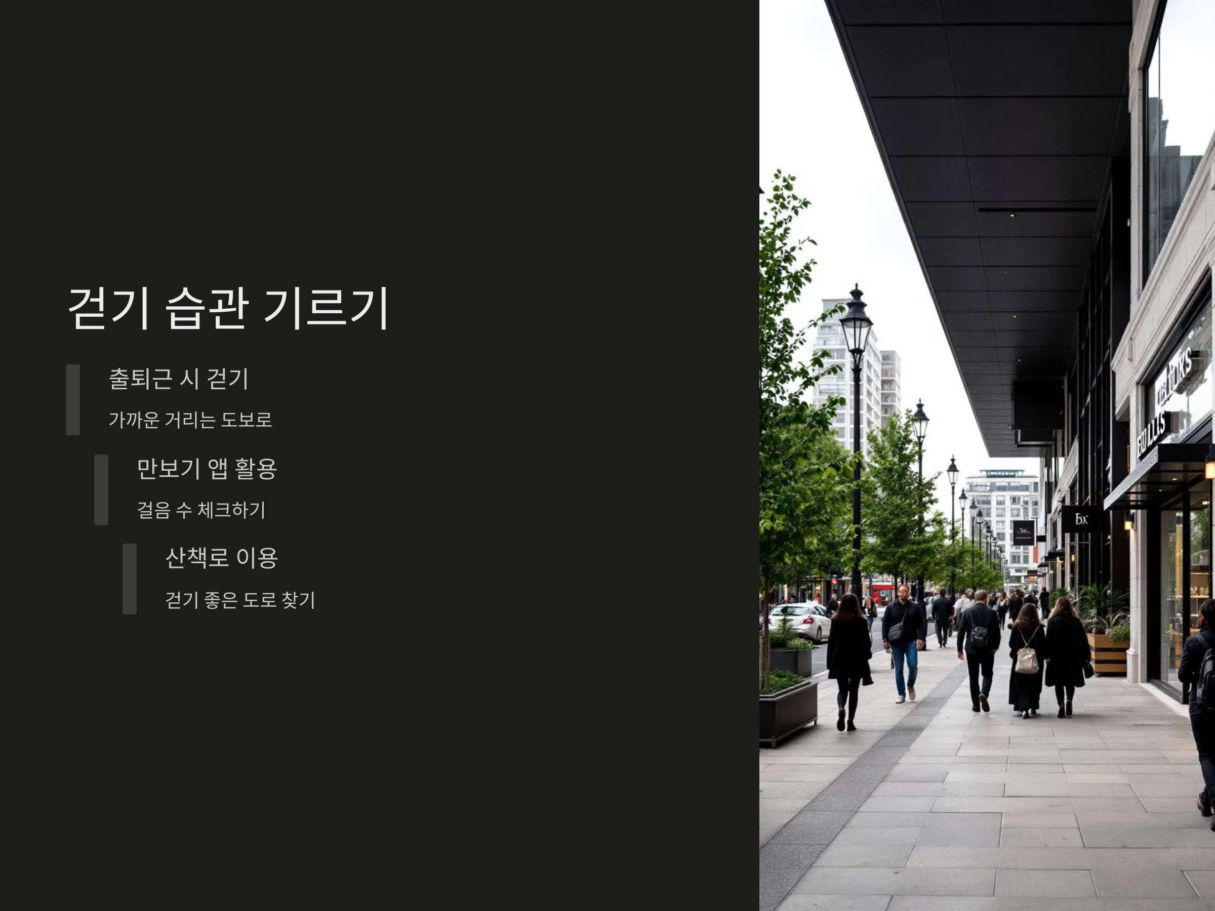 도보 이동은 건강에도 좋고 경제적입니다. 자동차 없이 생활할 때 걷는 습관을 들이면 자연스럽게 운동도 되고, 이동비도 아낄 수 있습니다.