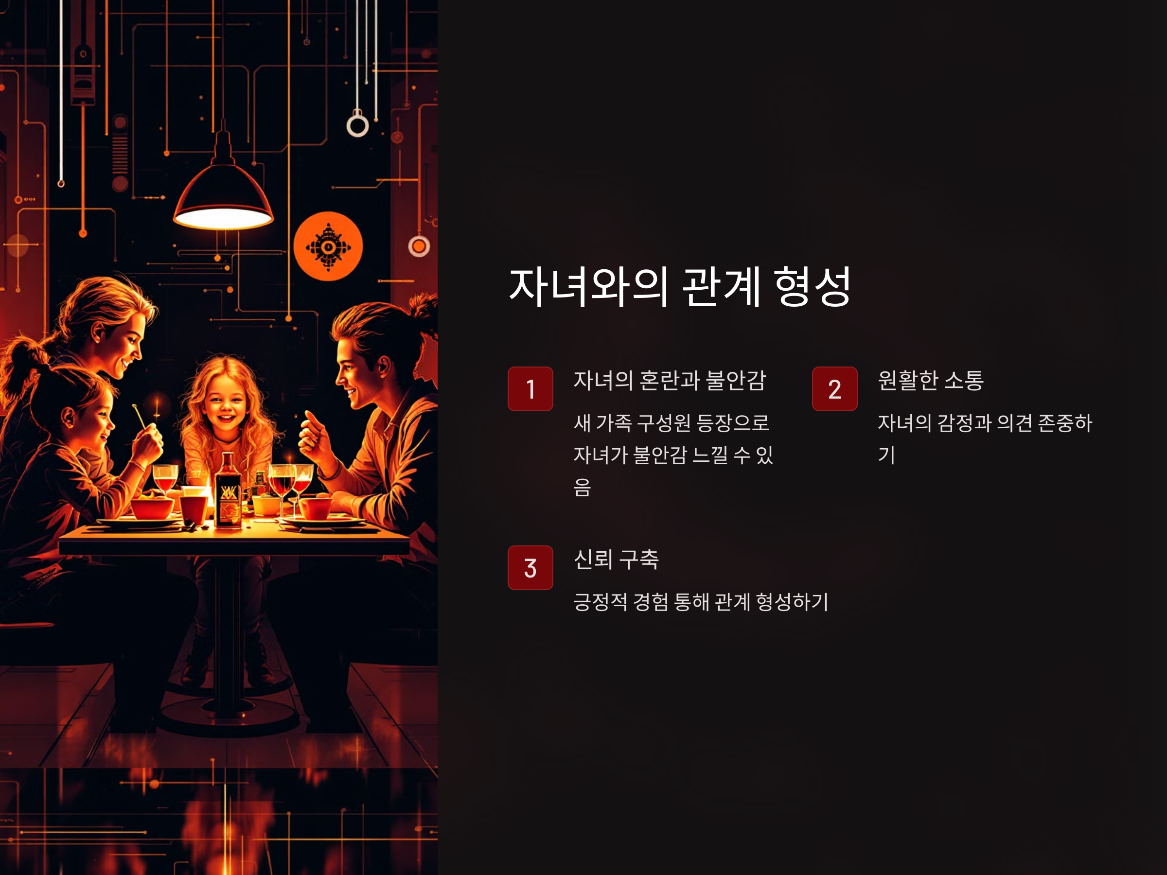 재혼 가정에서 가장 큰 고민 중 하나는 기존 자녀와의 관계 형성입니다. 자녀들은 새로운 부모나 형제자매의 등장으로 인해 혼란이나 불안감을 느낄 수 있습니다. 이러한 상황에서 자녀와의 원활한 소통과 신뢰 구축이 중요합니다. 자녀의 감정과 의견을 존중하고, 새로운 가족 구성원과의 긍정적인 경험을 통해 관계를 형성하는 것이 필요합니다.