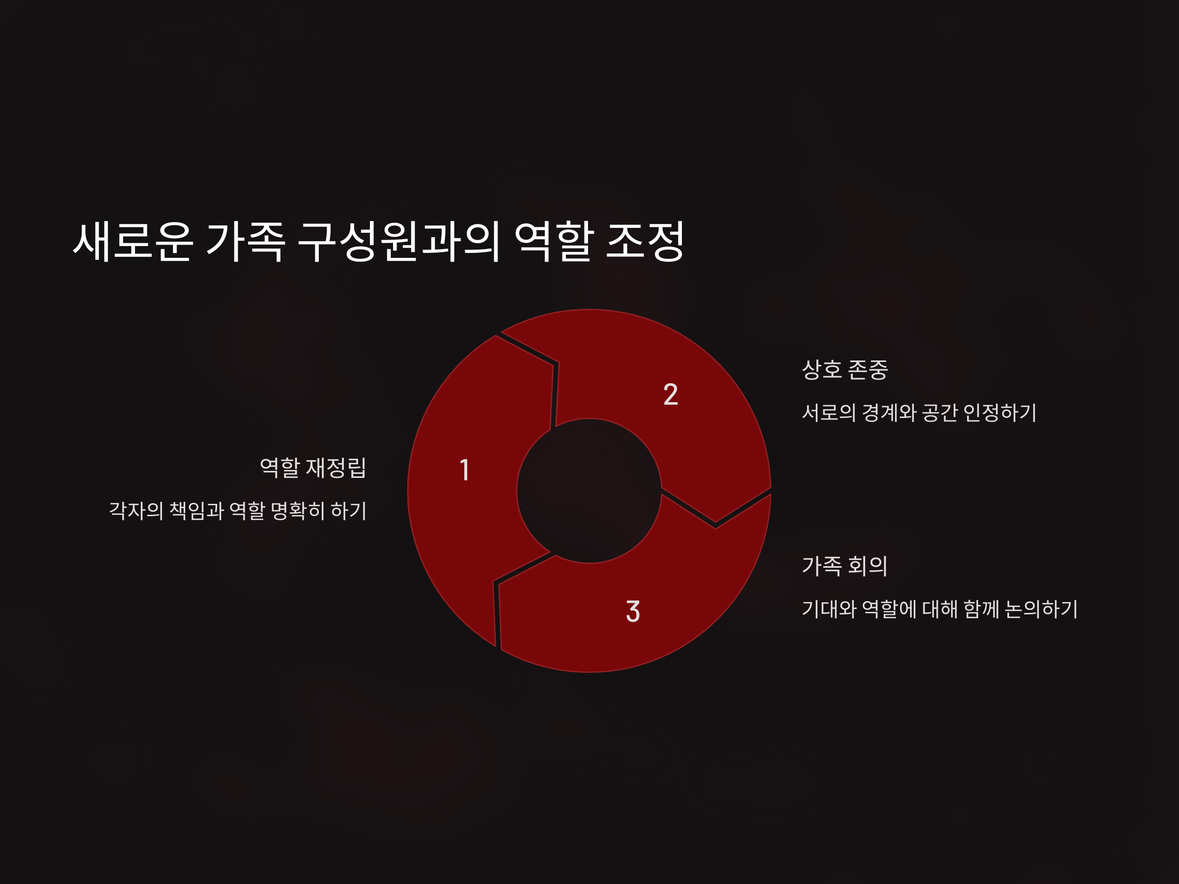재혼으로 인해 새로운 가족 구성원이 생기면, 각자의 역할과 책임을 재정립해야 합니다. 이 과정에서 혼란이나 갈등이 발생할 수 있으므로, 가족 구성원 간의 명확한 역할 분담과 상호 존중이 필요합니다. 가족 회의를 통해 서로의 기대와 역할을 논의하는 것이 도움이 될 수 있습니다.