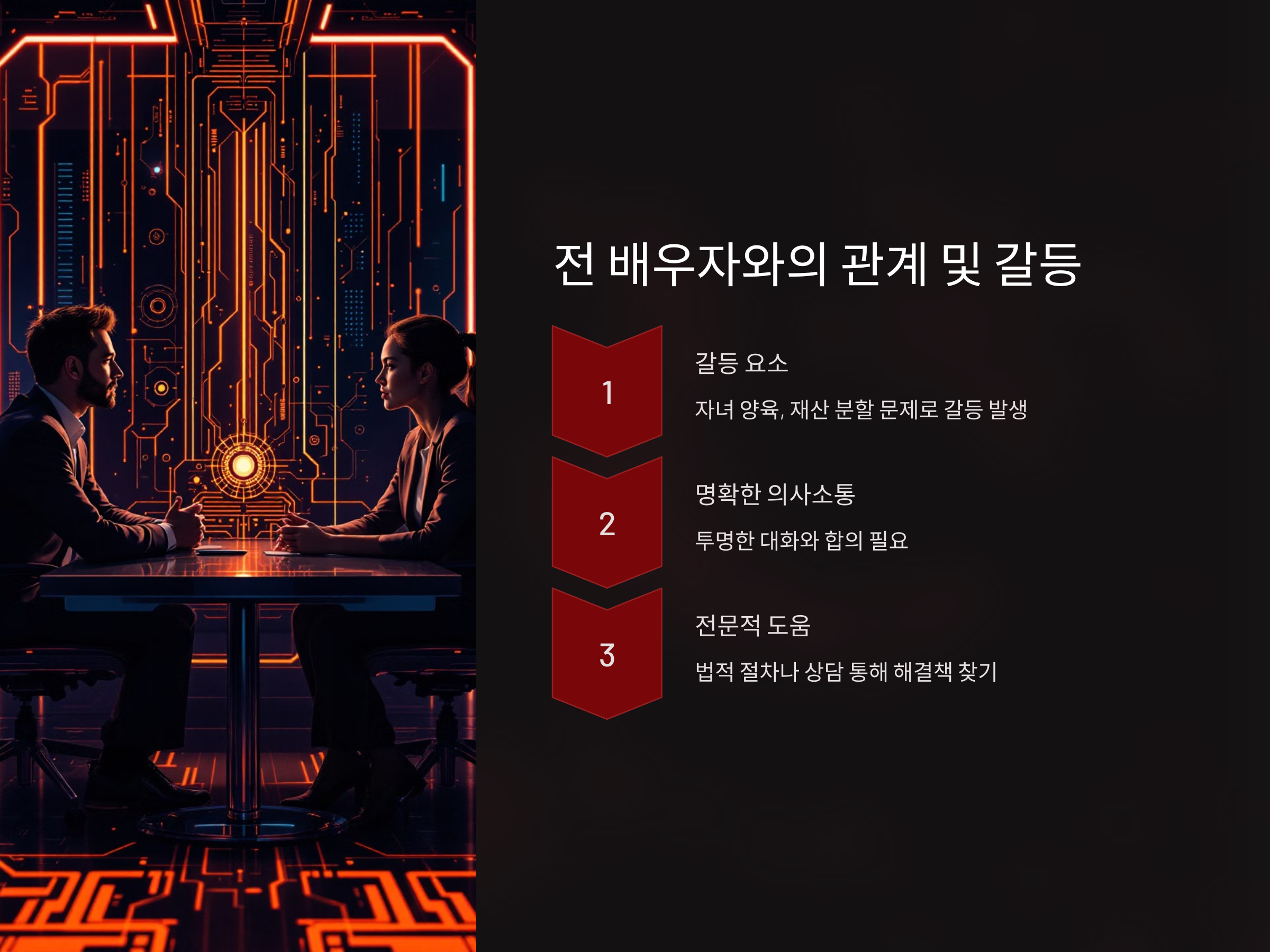 재혼 시 전 배우자와의 관계는 여전히 중요한 역할을 합니다. 특히 자녀 양육이나 재산 분할 등의 문제로 인해 갈등이 발생할 수 있습니다. 이러한 갈등을 최소화하기 위해서는 명확한 의사소통과 합의가 필요합니다. 법적 절차나 상담을 통해 공정한 해결책을 찾는 것이 도움이 될 수 있습니다.