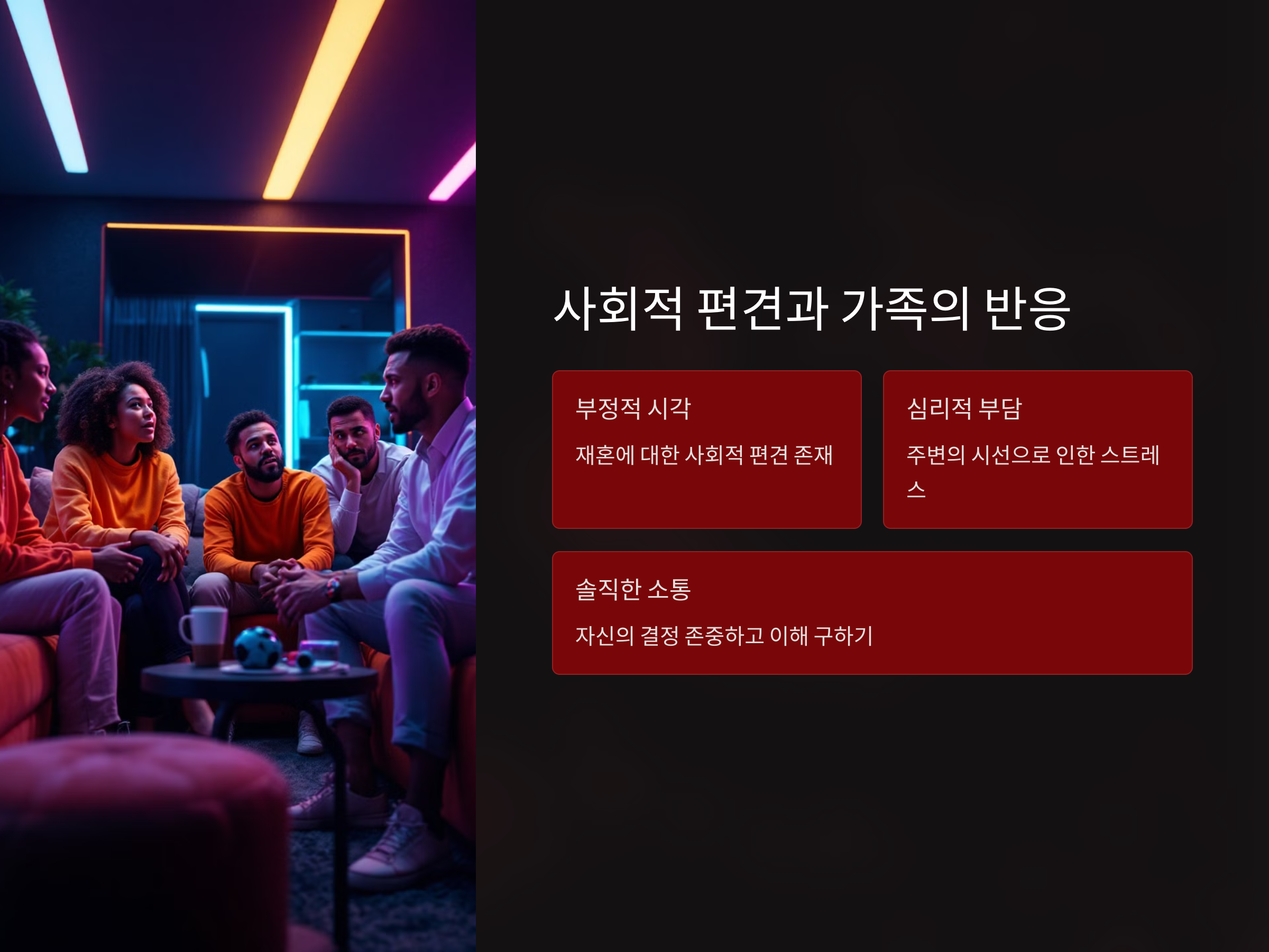 재혼에 대한 사회적 편견이나 가족의 반응도 고려해야 할 요소입니다. 일부 사람들은 재혼에 대해 부정적인 시각을 가질 수 있으며, 이는 재혼을 고려하는 사람들에게 심리적인 부담이 될 수 있습니다. 이러한 상황에서는 자신의 결정을 존중하고, 주변 사람들과 솔직하게 소통하며 이해를 구하는 것이 중요합니다.
