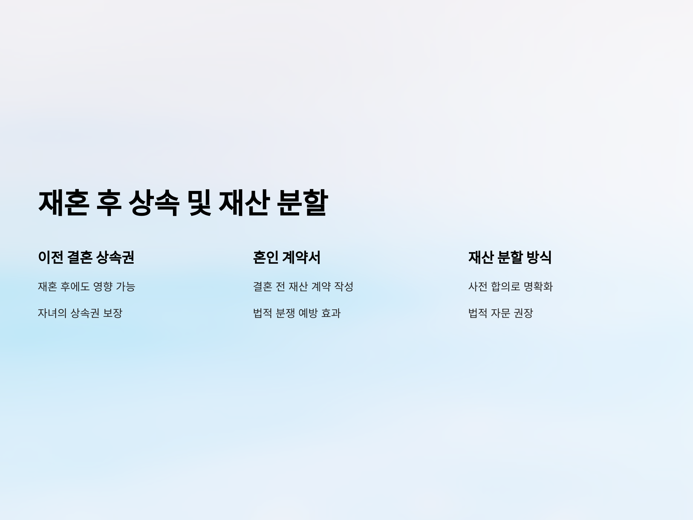 재혼 후에는 상속 문제와 재산 분할에 대한 법적 고려도 필요합니다. 이전 결혼에서 상속권이 존재할 수 있으며, 재혼 후에도 그와 관련된 법적 문제가 발생할 수 있습니다. 만약 이전 결혼에서 자녀나 배우자에게 상속권이 있다면, 재혼 후의 상속권에도 영향을 미칠 수 있습니다.