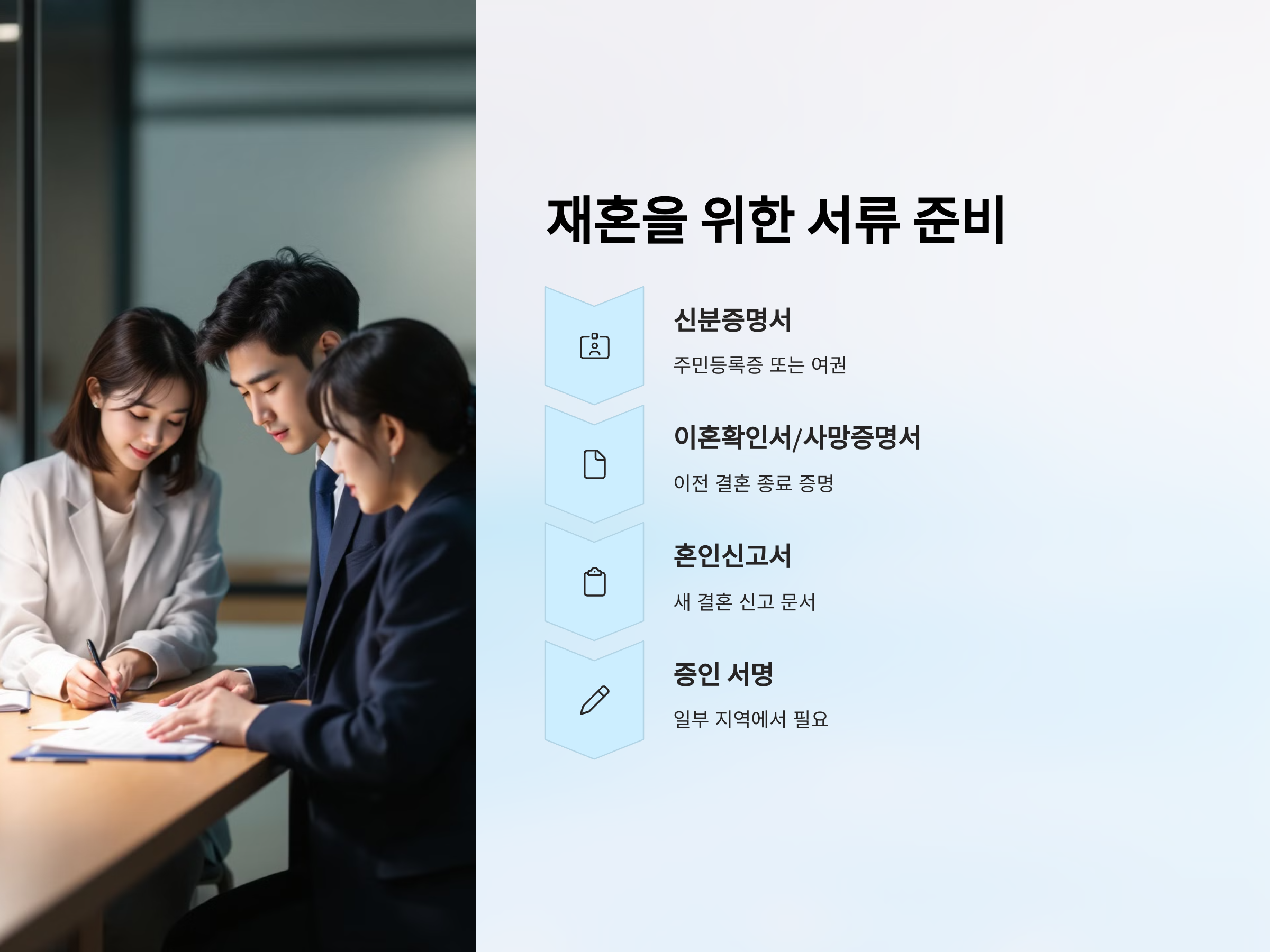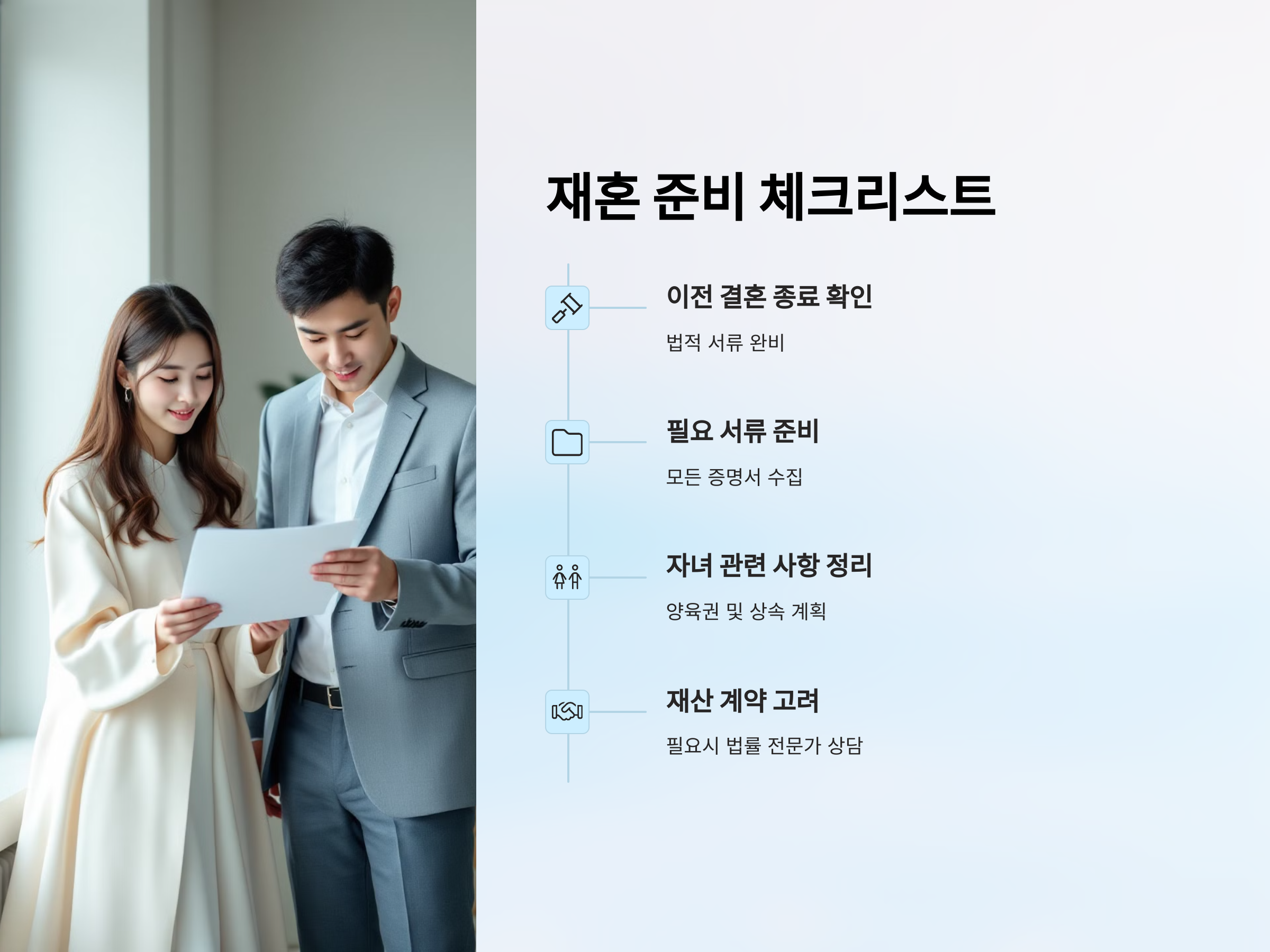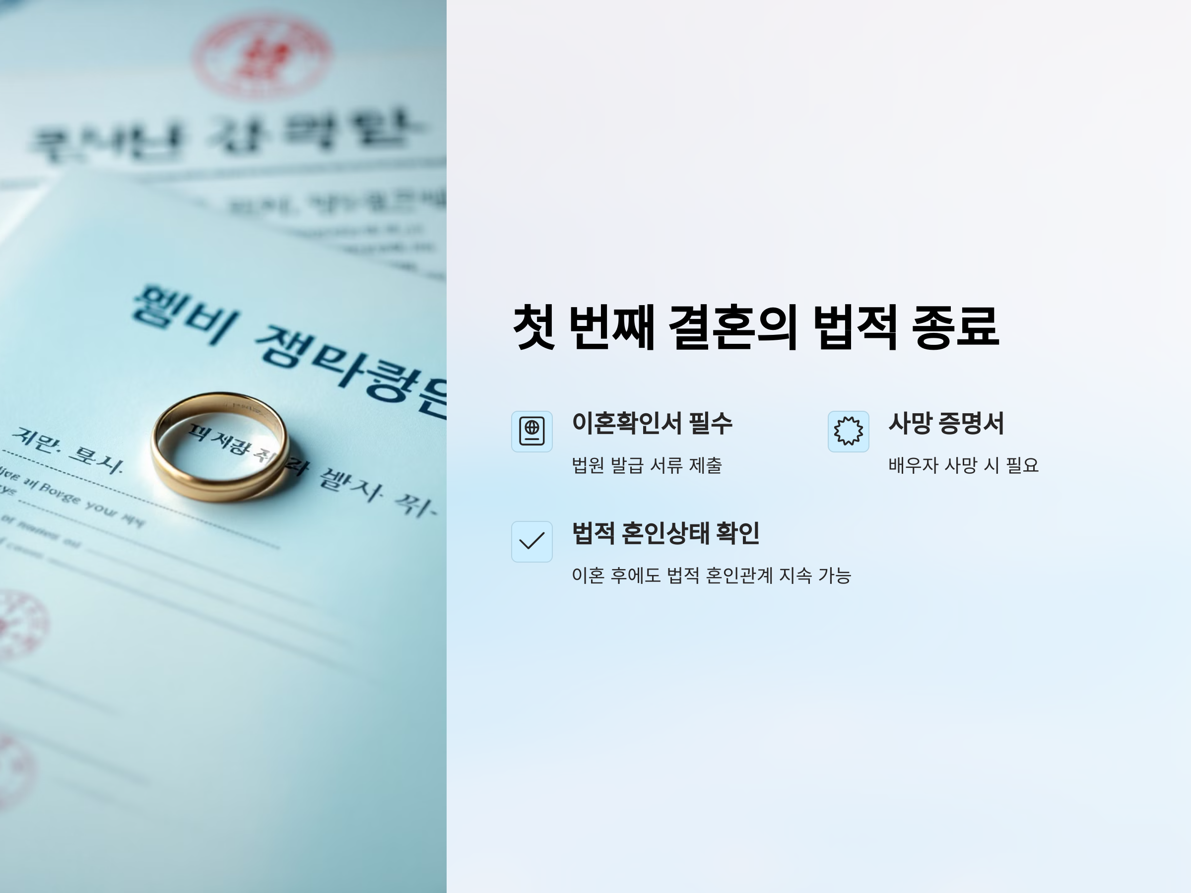 이혼 후에도 법적으로 혼인 상태가 지속될 수 있으므로, 이혼을 법적으로 완결 짓는 것이 첫 번째 단계입니다. 이혼 후에도 한동안 법적으로 혼인 관계가 유지되기 때문에 재혼 전에 이혼 서류를 반드시 확인하고 준비하는 것이 중요합니다.
