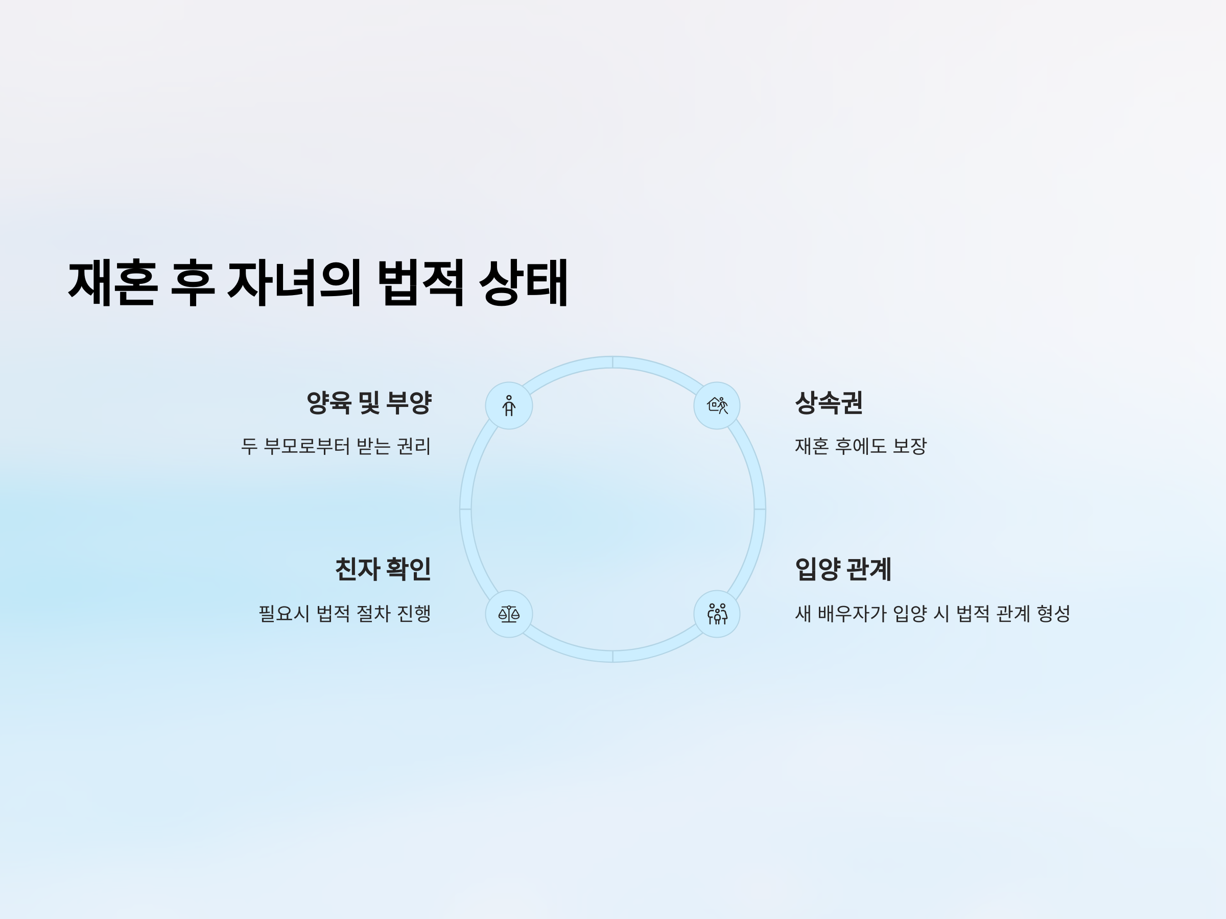 재혼 후 자녀가 있다면, 자녀의 법적 상태도 중요한 이슈가 됩니다. 재혼한 부모의 자녀는 법적으로 두 명의 부모로부터 양육 및 부양을 받게 되며, 부모의 상속권도 영향을 받을 수 있습니다. 새로운 배우자가 자녀를 입양하는 경우, 양자 관계가 성립되며 법적으로 상속권이나 의무가 발생합니다.