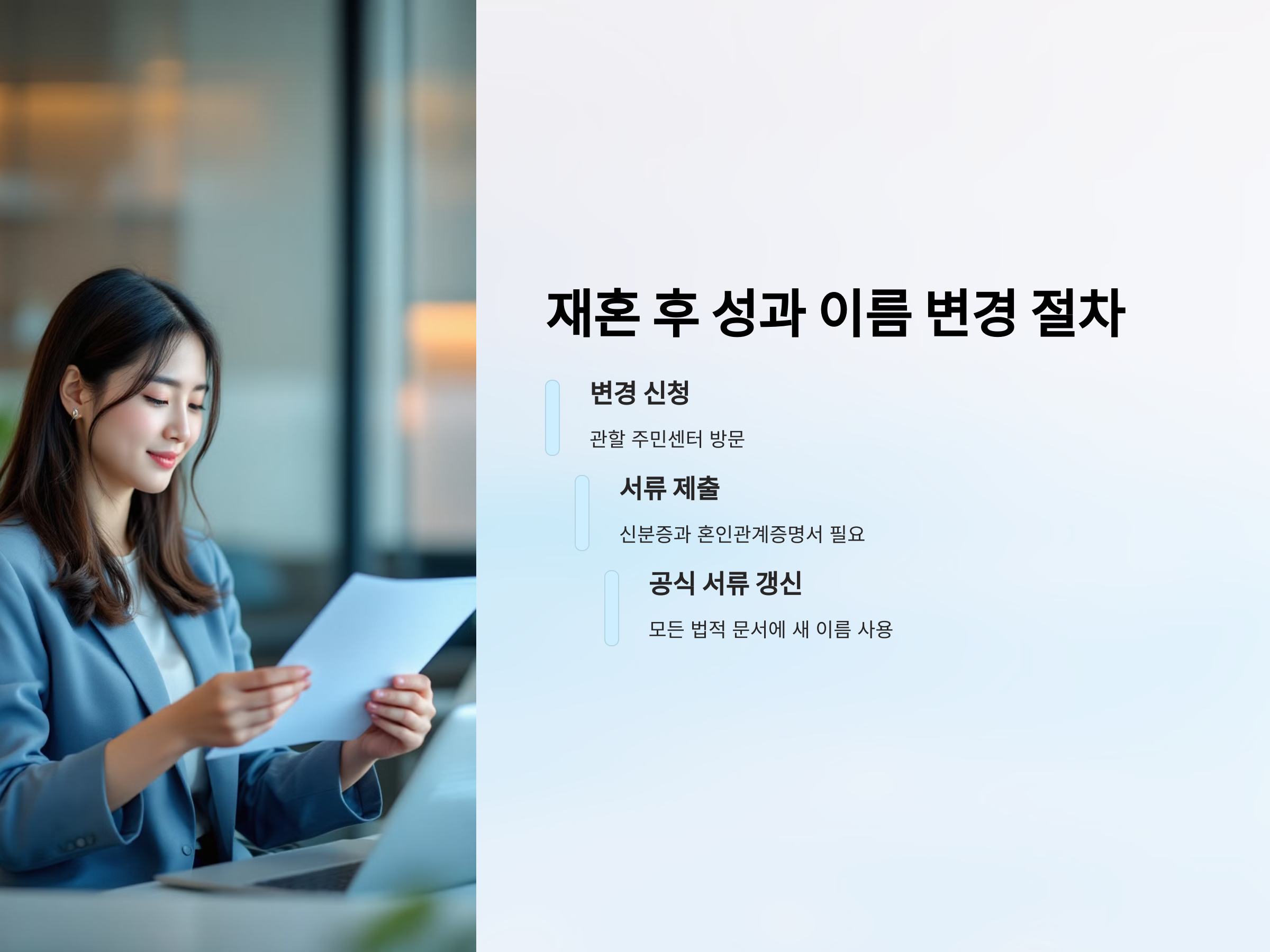 재혼을 하게 되면, 성과 이름을 변경하는 경우가 있을 수 있습니다. 이는 특별히 여성이 성을 변경하는 경우에 해당하는데, 재혼 후 성을 변경하는 경우에는 관할 주민센터에서 이름 변경 절차를 진행할 수 있습니다. 이름 변경은 법적 효력을 가지기 때문에, 변경 후 모든 공식 서류에서 새로운 이름을 사용해야 합니다.