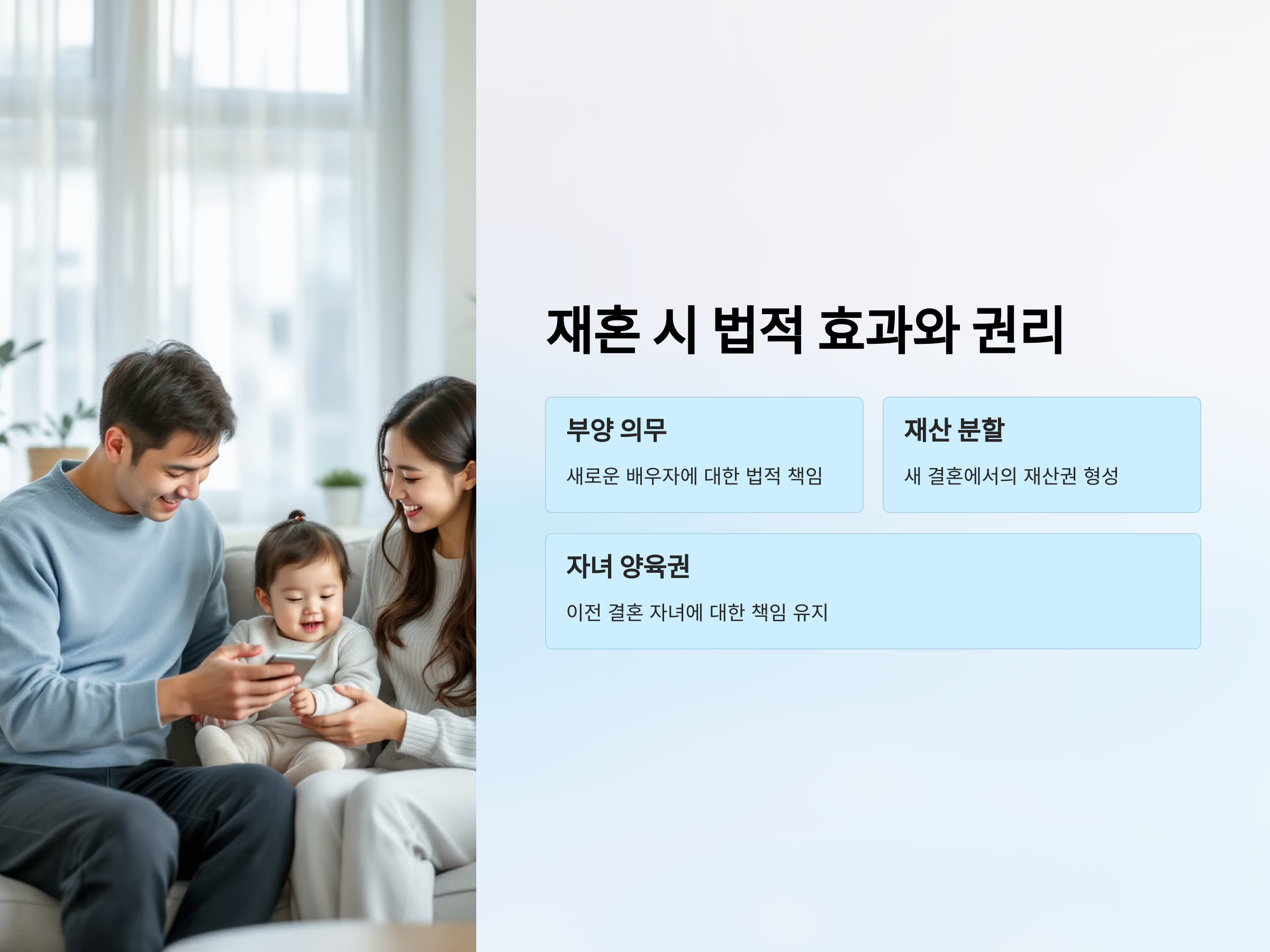재혼을 하게 되면 법적으로도 새로운 결혼 상태가 인정됩니다. 이는 부양 의무, 재산 분할, 자녀 양육권 등의 법적 효과를 수반합니다. 재혼을 한 후에는 부부 간의 법적 권리와 의무가 새롭게 형성되며, 과거의 결혼 상태에서 발생한 법적 문제들과는 별개로 취급됩니다.