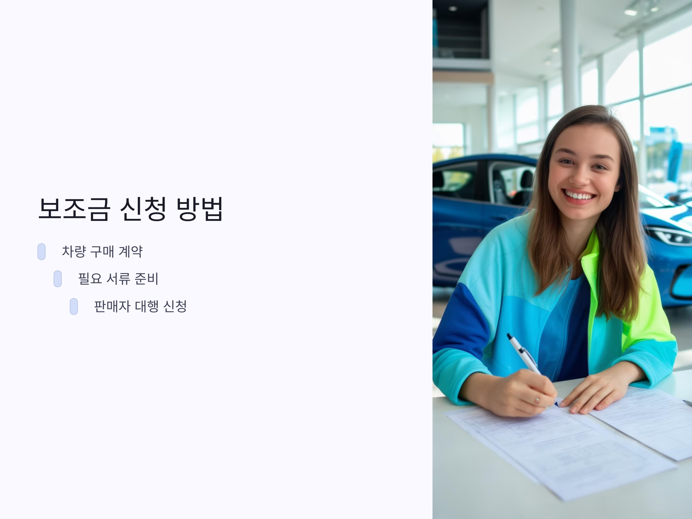 전기차 보조금을 받기 위해서는 몇 가지 절차가 필요합니다. 대부분의 경우, 보조금 신청은 차량을 구매하기 전 후, 판매자와 함께 진행되며, 판매자가 정부와 지방자치단체에 신청을 대행해주는 방식입니다.