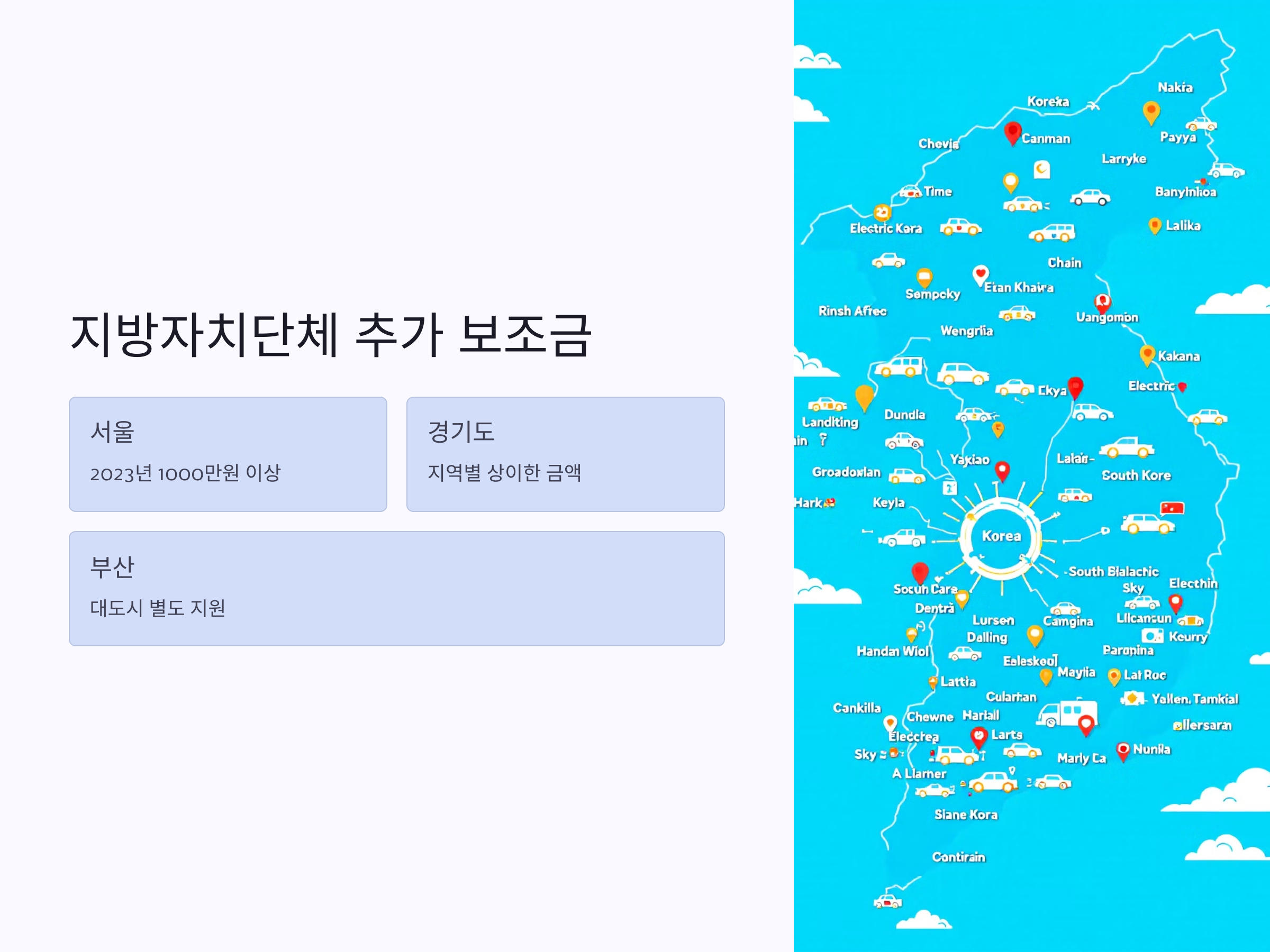 전기차를 구매할 때는 지방자치단체에서도 추가적인 보조금을 제공하고 있다는 사실을 알아야 합니다. 지방자치단체는 정부의 기본 보조금 외에도 추가적인 혜택을 제공하기 때문에, 구매하고자 하는 지역에 따라 받을 수 있는 혜택이 달라질 수 있습니다.