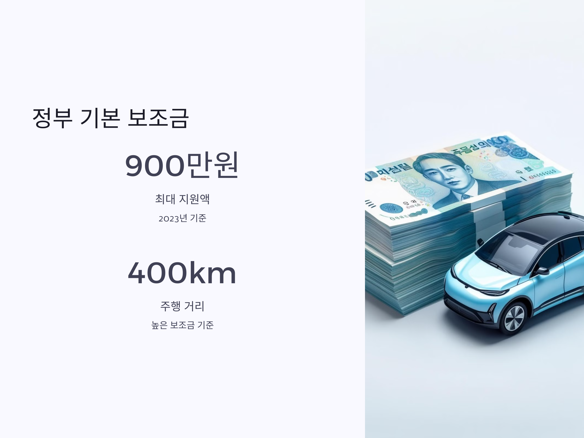 2023년 기준으로, 정부는 최대 900만원까지 전기차 보조금을 지원하고 있습니다. 기본적으로 전기차의 구매 가격에 따라 지원액이 달라지며, 차량의 종류와 배터리 용량에 따라 달라질 수 있습니다. 예를 들어, 1회 충전으로 400km 이상 주행 가능한 차량일 경우 더 높은 보조금을 받을 수 있는 경우가 많습니다.