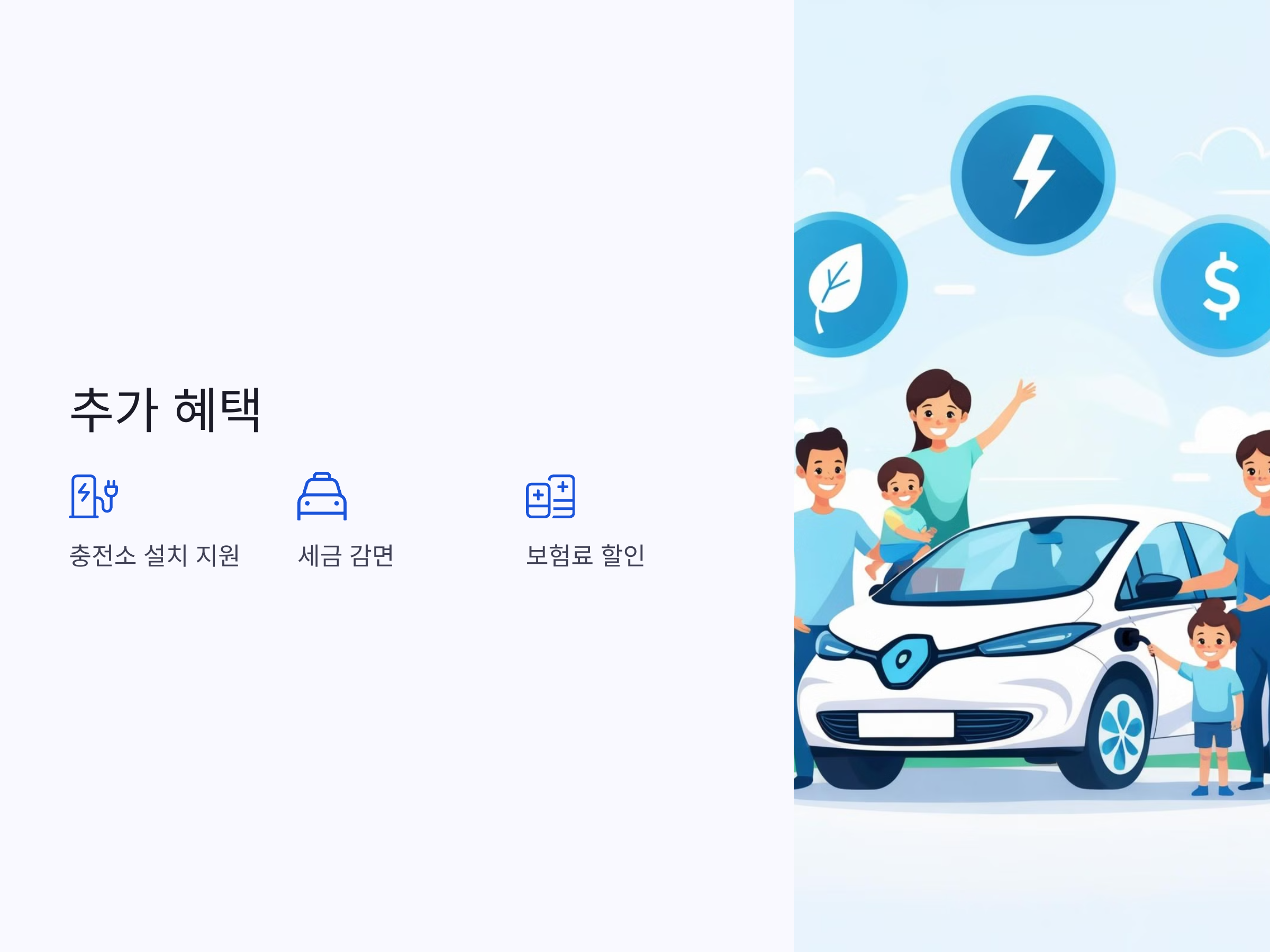 전기차 구매 시 정부 보조금 외에도 여러 가지 혜택을 받을 수 있습니다. 예를 들어, 전기차 충전소 설치 지원, 세금 감면, 보험료 할인 등 다양한 혜택이 존재합니다. 이들 혜택은 구매자가 전기차를 구입한 뒤에도 지속적으로 적용되므로, 보조금 외에도 장기적으로 혜택을 잘 활용하는 것이 중요합니다.