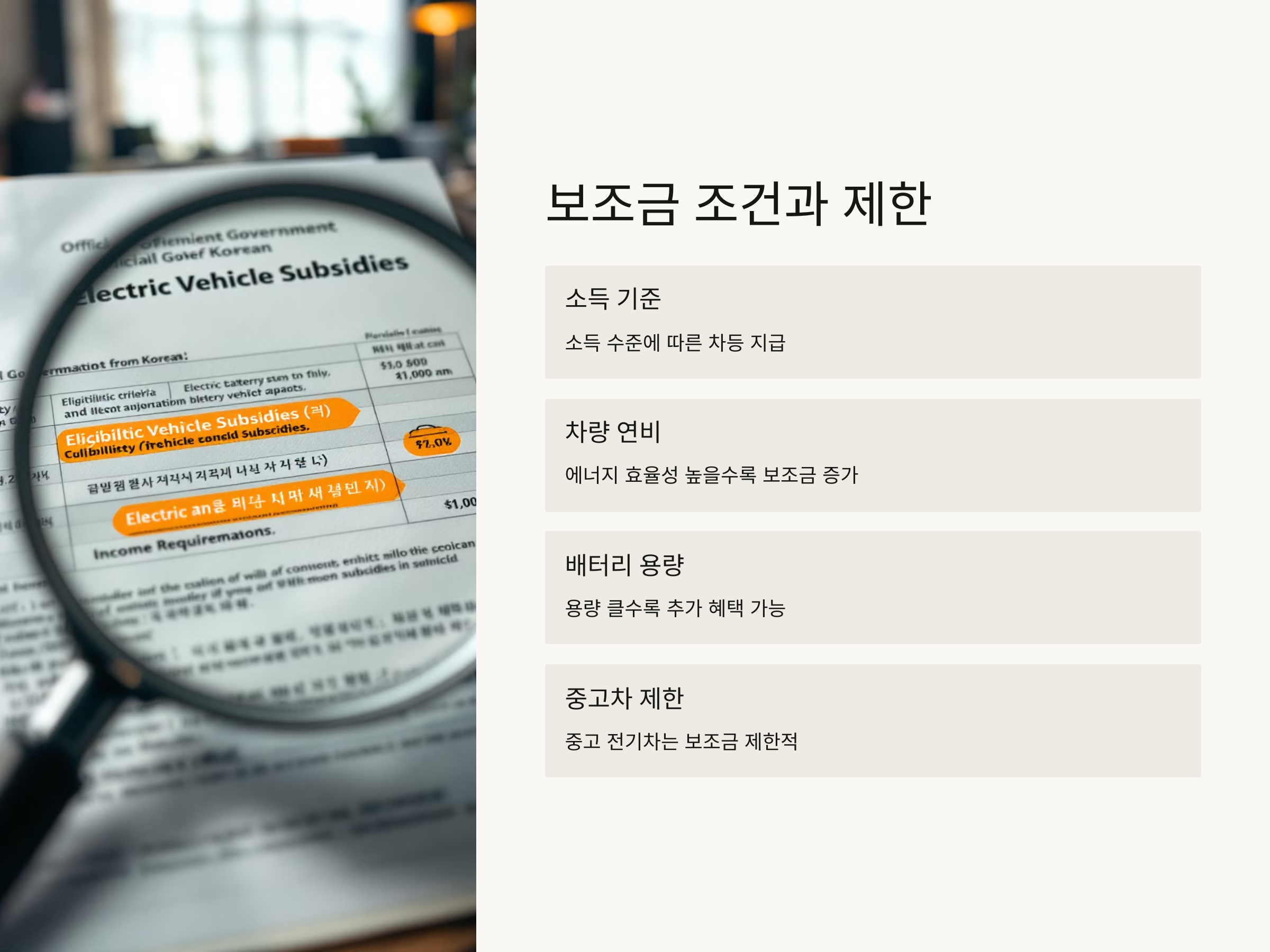 전기차 보조금에는 몇 가지 중요한 조건과 제한이 존재합니다. 대표적으로 소득 기준, 차량 연비 및 전기차 배터리 용량 등이 해당됩니다.