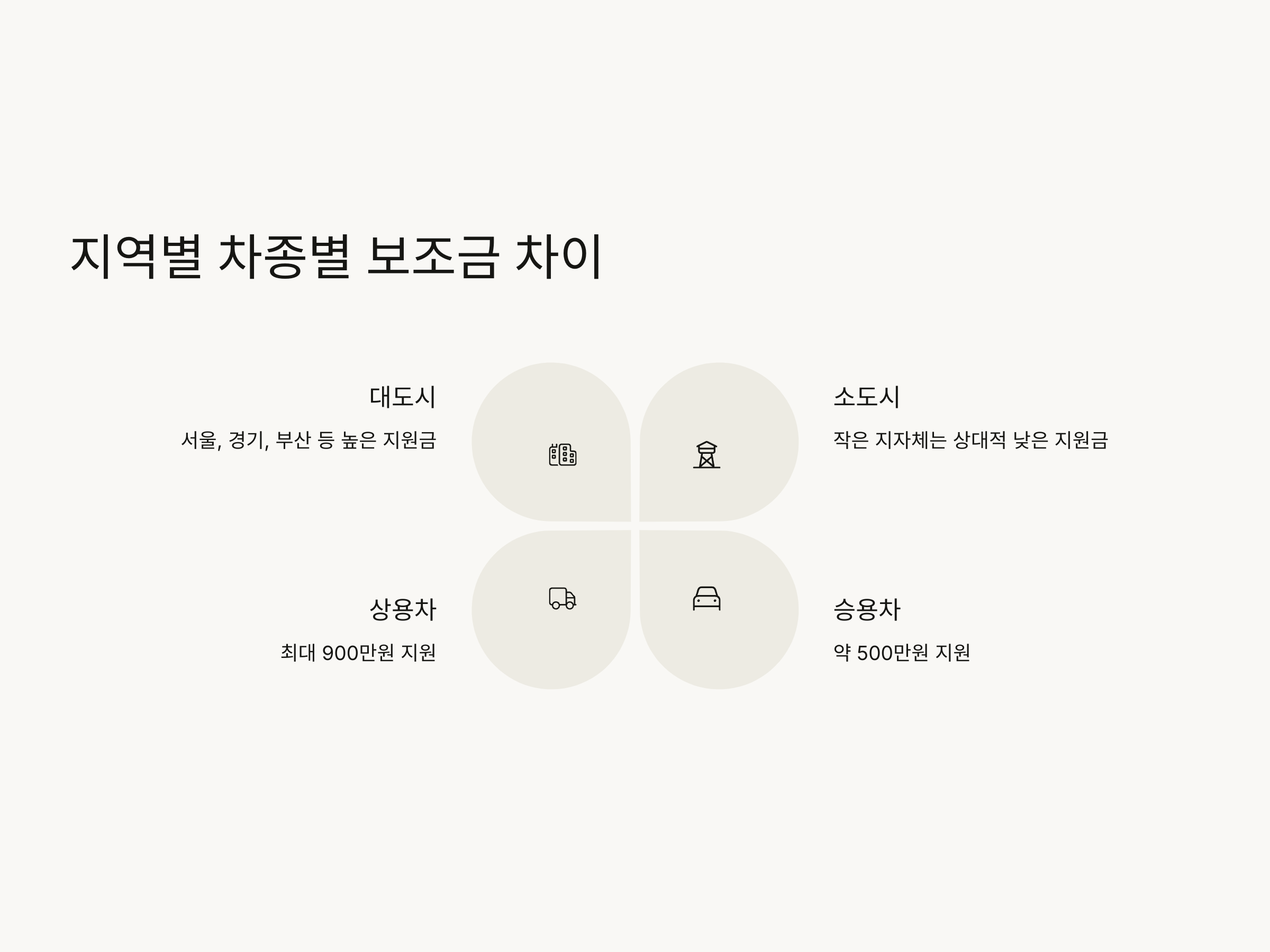 전기차 보조금은 지역별로 차등 지급됩니다. 서울, 경기, 부산 등 대도시는 보다 많은 지원금을 제공하는 반면, 작은 지자체에서는 상대적으로 낮은 지원금을 받을 수 있습니다. 또한, 차종에 따라 지원금액이 다르게 적용됩니다. 예를 들어, 승용차와 상용차는 보조금 금액에 차이가 있습니다. 일반 승용차는 약 500만원을 지원받을 수 있지만, 대형 상용차나 트럭은 900만원까지 지원이 가능합니다.