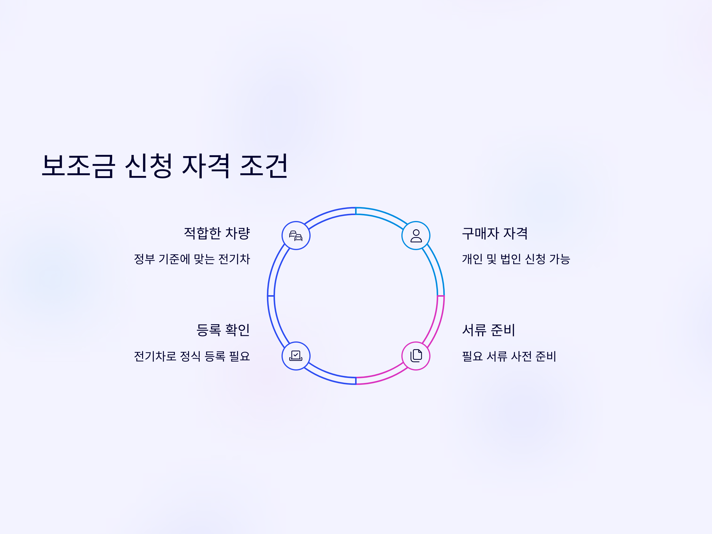 또한, 구매자가 보조금을 신청할 수 있는 자격을 갖추고 있는지도 확인해야 합니다. 보통 보조금은 개인과 법인 모두 신청할 수 있지만, 일부 경우에는 특정 조건이 충족되어야 할 수 있습니다. 예를 들어, 자가용 외에 렌터카나 택시 등의 상용 차량에 대해 보조금 지급이 제한될 수 있습니다.