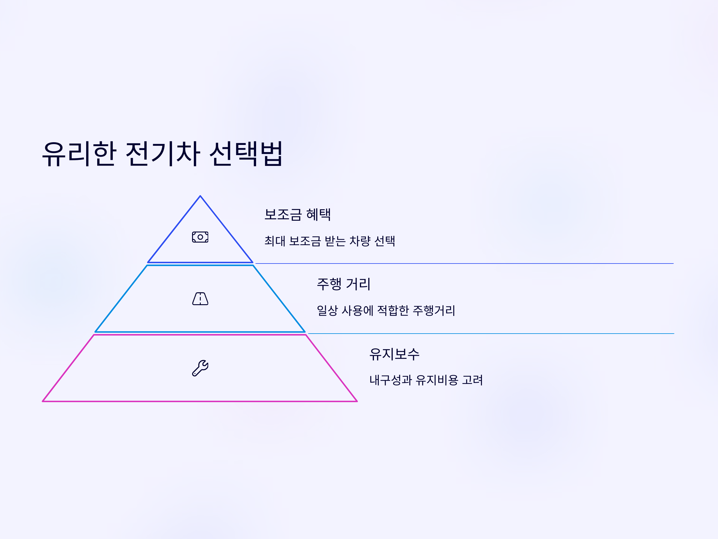 전기차를 선택할 때 중요한 요소는 여러 가지가 있습니다. 먼저, 보조금을 많이 받을 수 있는 차량을 고르는 것이 중요합니다. 대부분의 전기차 보조금은 차량 가격과 배터리 용량에 따라 다르게 지급되므로, 예산 내에서 가장 많은 보조금을 받을 수 있는 차량을 선택하는 것이 유리합니다.