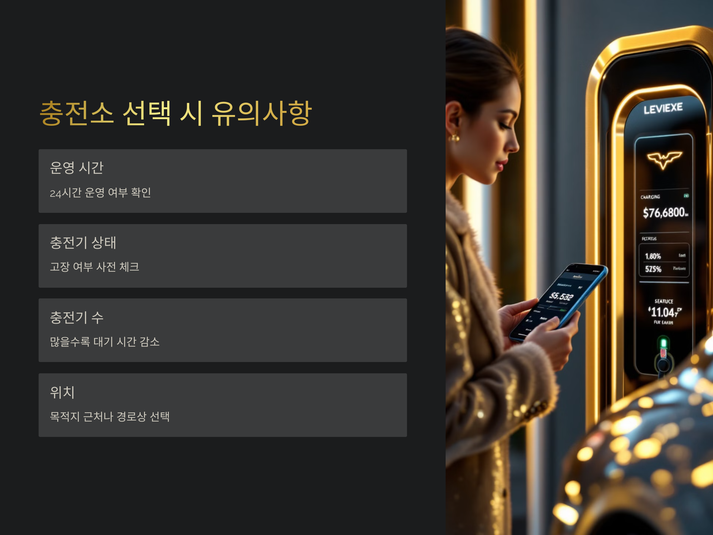 - 위치: 목적지 근처나 경로 상에 있는 충전소를 선택하면 불필요한 이동을 줄일 수 있습니다.