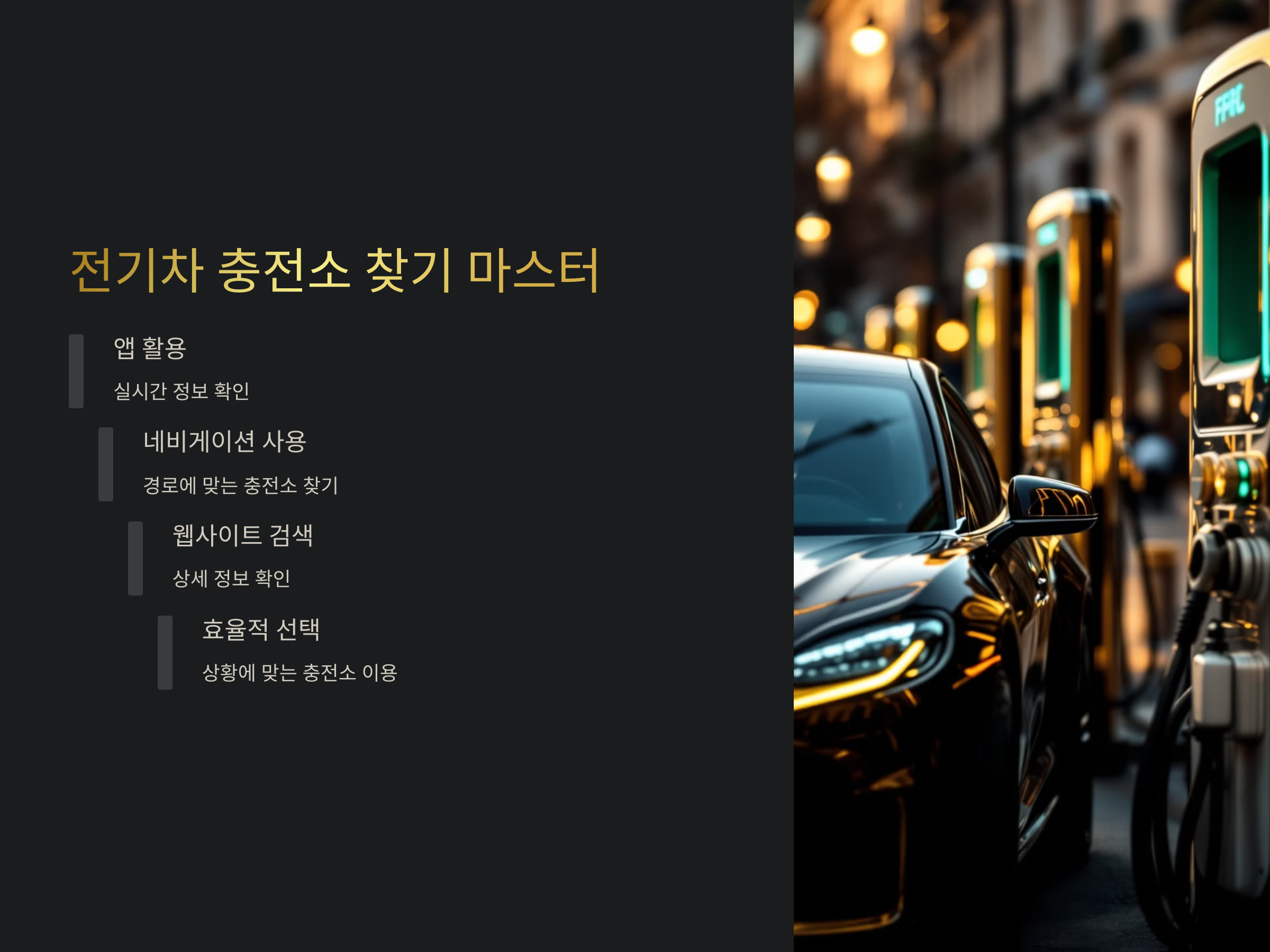 전기차 충전소를 찾는 것은 이제 매우 쉬운 일입니다. 스마트폰 앱, 네비게이션 시스템, 웹사이트 등을 통해 손쉽게 충전소를 찾을 수 있으며, 실시간 상태 정보를 제공하는 앱과 웹사이트를 활용하면 더욱 효율적으로 충전소를 이용할 수 있습니다. 또한, 충전소의 운영 시간과 상태를 미리 확인하고, 급속 충전소와 완속 충전소의 차이를 알고 효율적으로 충전하는 것이 중요합니다. 이제는 더 이상 전기차 충전소를 찾는 데 어려움을 겪지 않게 되었습니다.