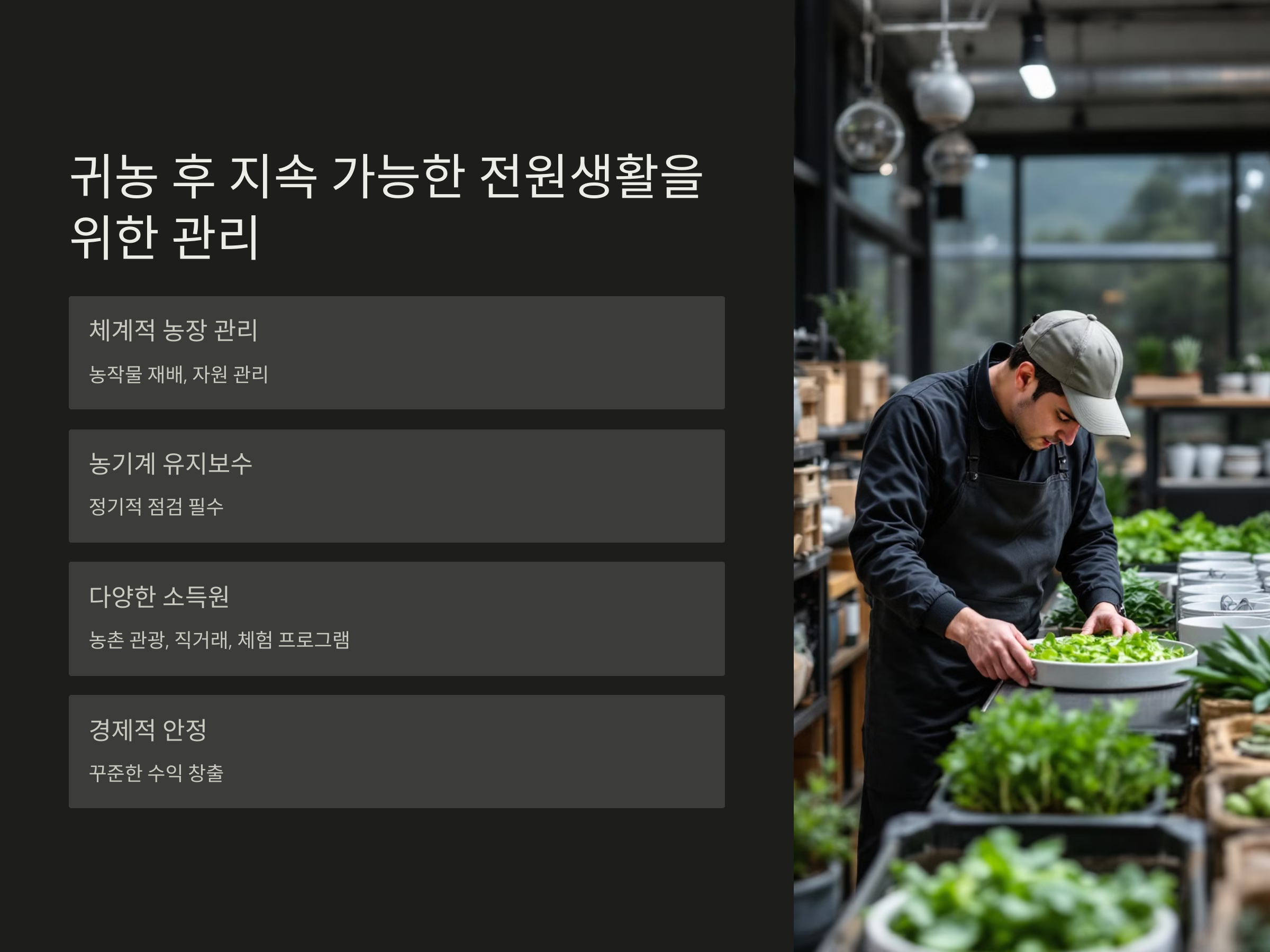 귀농 후에는 지속 가능한 농업과 생활을 위한 체계적인 관리가 필요합니다. 농작물의 재배와 더불어 자원의 관리, 농기계의 유지보수, 농장 관리 등을 체계적으로 계획하여 운영해야 합니다. 이를 통해 농업이 성장하고, 보다 효율적으로 자원을 활용할 수 있습니다.