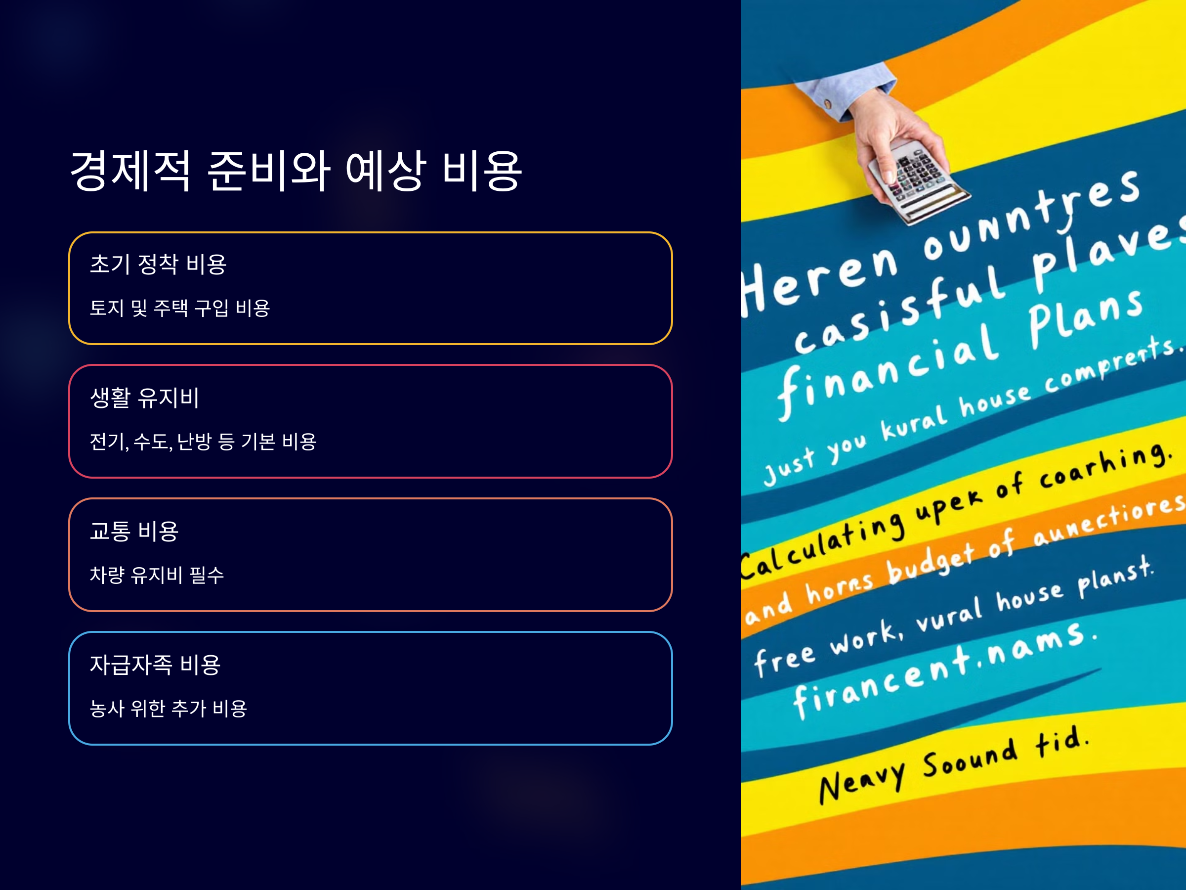 전원생활을 하려면 초기 정착 비용과 지속적인 생활비를 꼼꼼히 따져봐야 합니다. 특히 예상보다 많은 비용이 발생할 수 있기 때문에 현실적인 재정 계획이 필요합니다.