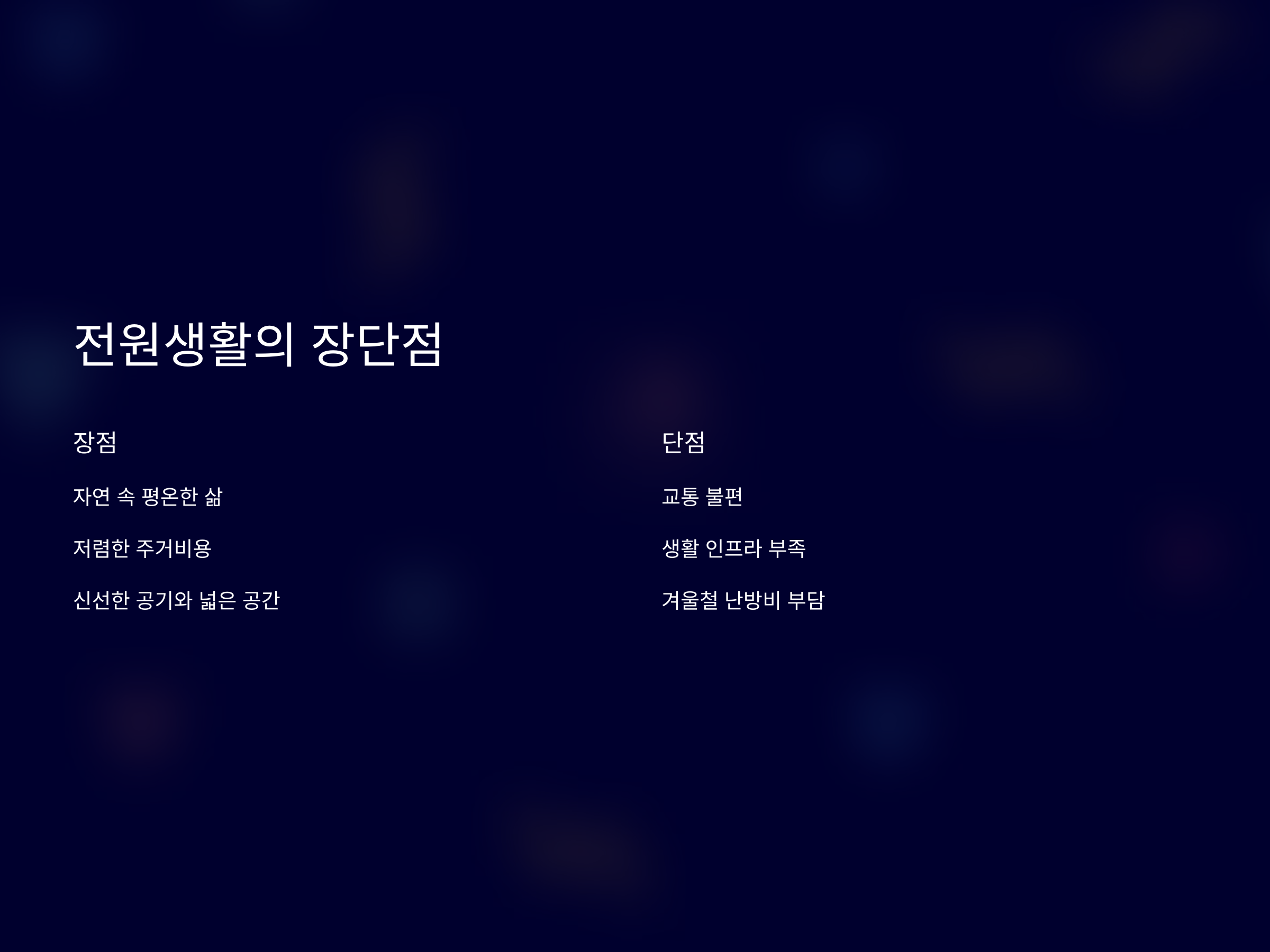 전원생활의 가장 큰 장점은 자연 속에서의 평온한 삶과 상대적으로 저렴한 주거비용입니다. 또한 신선한 공기와 넓은 생활 공간을 누릴 수 있어 건강한 생활이 가능합니다. 하지만 단점도 존재합니다. 교통이 불편하고 병원이나 마트 같은 생활 인프라가 부족할 수 있으며, 겨울철 난방비 부담이 커질 수도 있습니다. 이러한 장단점을 충분히 고려한 후, 본인의 라이프스타일과 맞는지 신중히 판단해야 합니다.