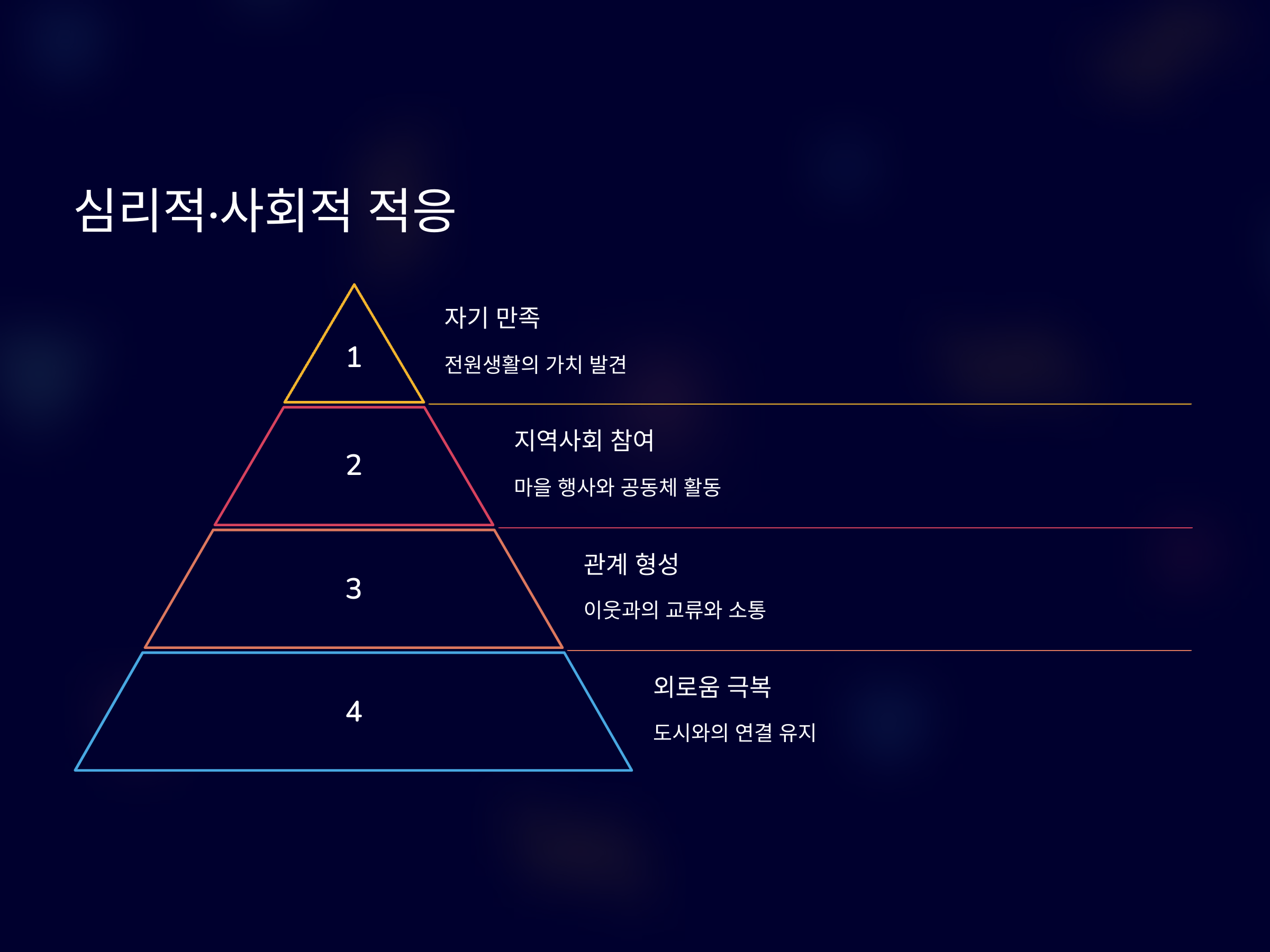 - 외로움 극복 방법 마련: 도시 생활과 달리 주변에 사람이 적을 수 있음
