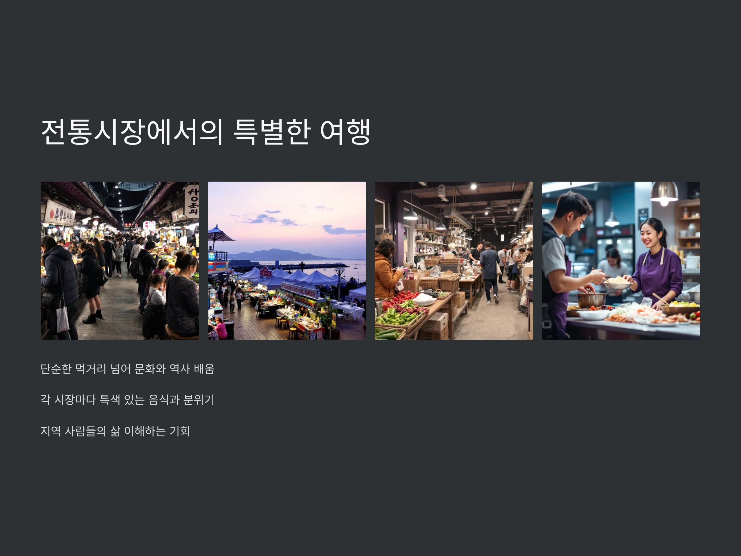 전통시장에서의 투어는 단순히 먹거리를 즐기는 것을 넘어, 그 지역의 고유한 문화와 역사를 배우는 기회가 됩니다. 각 시장마다 특색 있는 음식과 분위기를 느낄 수 있기 때문에, 여행 중 놓쳐서는 안 될 필수 방문지로 손꼽힙니다. 서울, 부산, 대구 등 다양한 지역의 전통시장에서만 만날 수 있는 음식들을 맛보고, 그 지역 사람들의 삶을 이해할 수 있는 기회를 가져보세요. 그리고 무엇보다 전통시장에서의 맛있는 음식을 즐기며 잊지 못할 추억을 만들어 보세요.