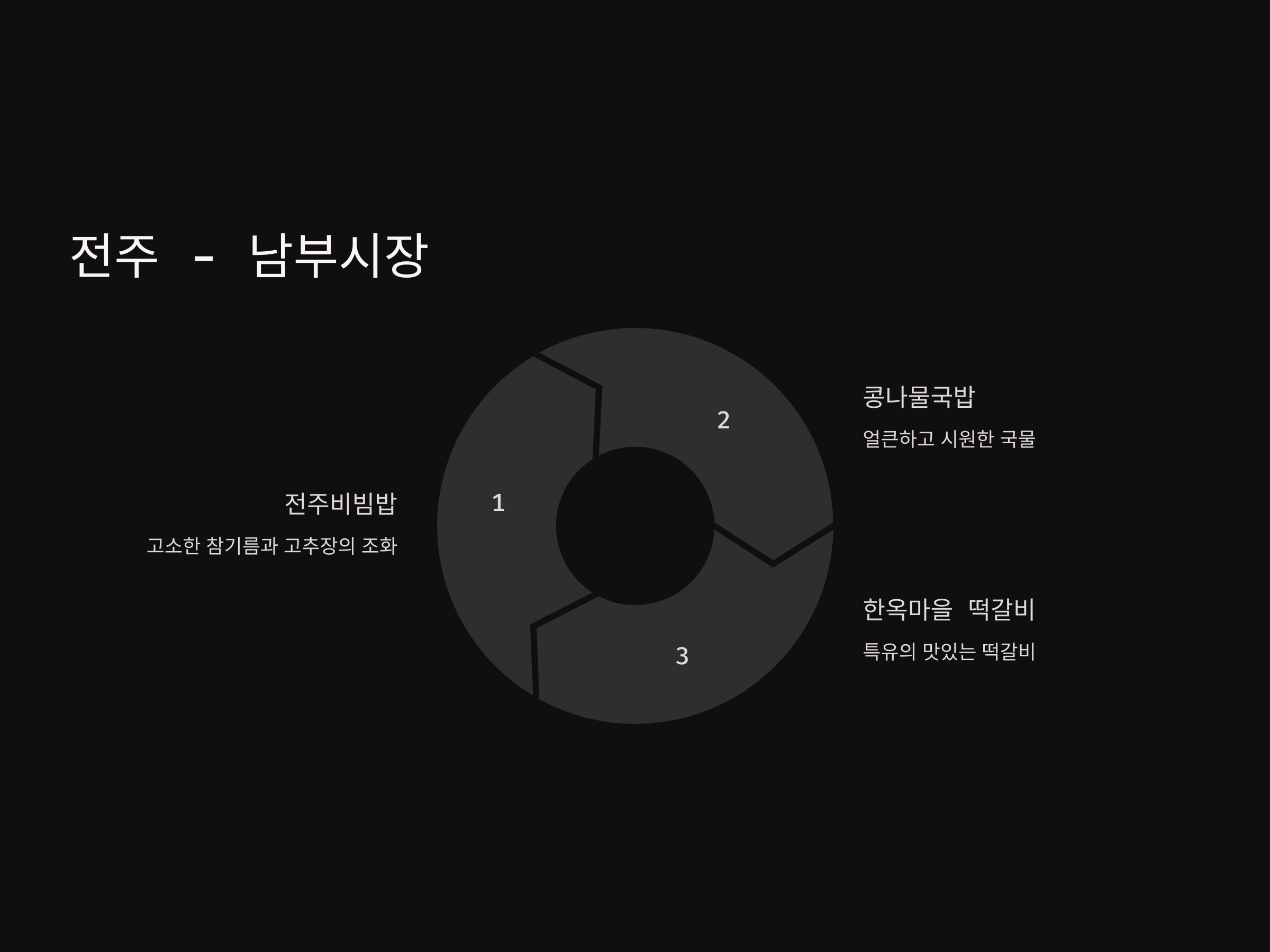- 전주비빔밥: 전주의 대표 음식인 비빔밥을 남부시장에서 맛보세요. 고소한 참기름과 고추장이 어우러진 맛이 일품입니다.