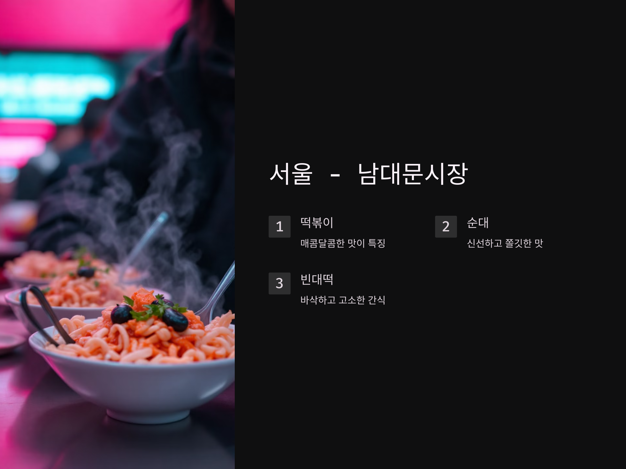 - 남대문시장 중앙에서 시작: 다양한 먹거리가 밀집한 이곳에서 전통적인 간식과 음식을 맛보며 여유롭게 쇼핑을 즐기세요.