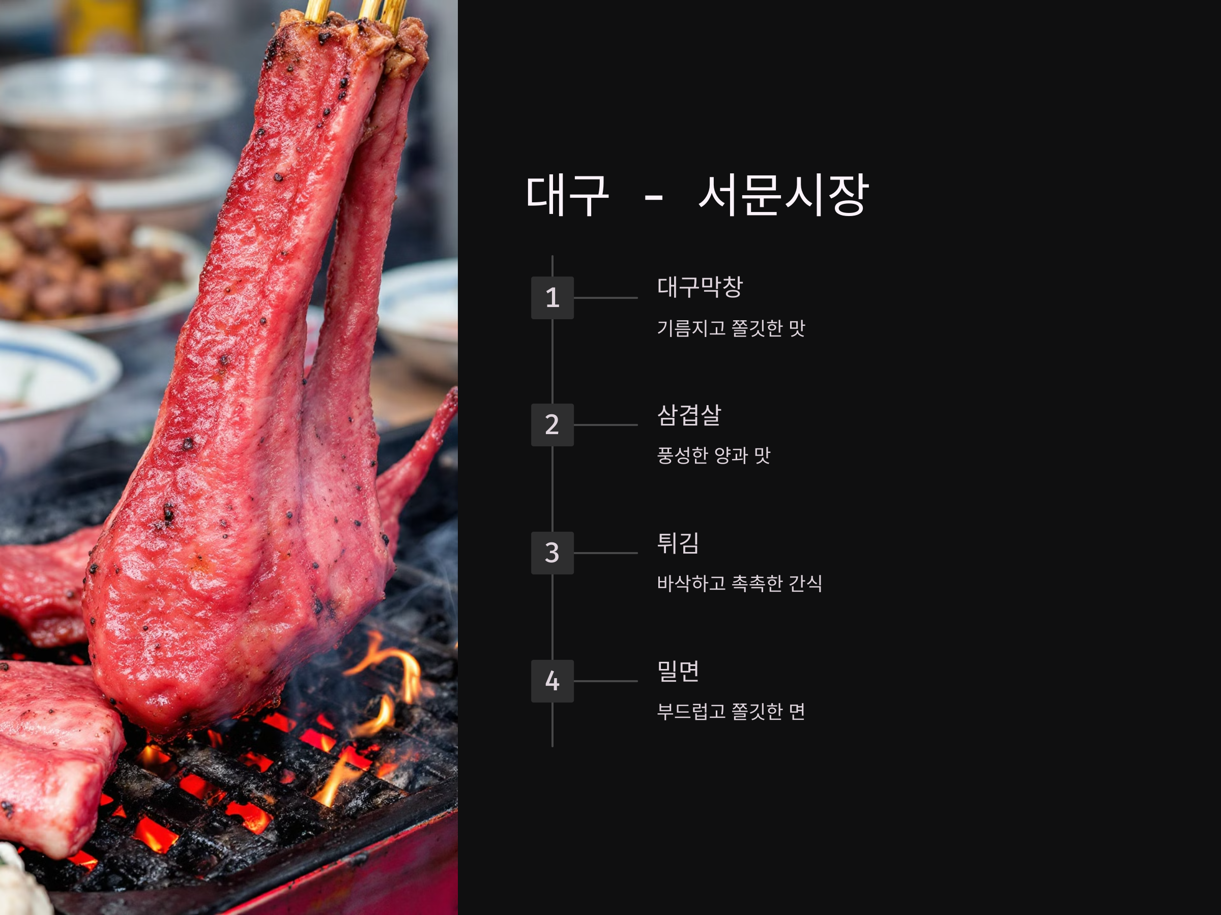 - 서문시장에서 먹거리 탐방: 서문시장에서 막창과 삼겹살을 먹으며 대구의 맛을 제대로 느껴보세요.