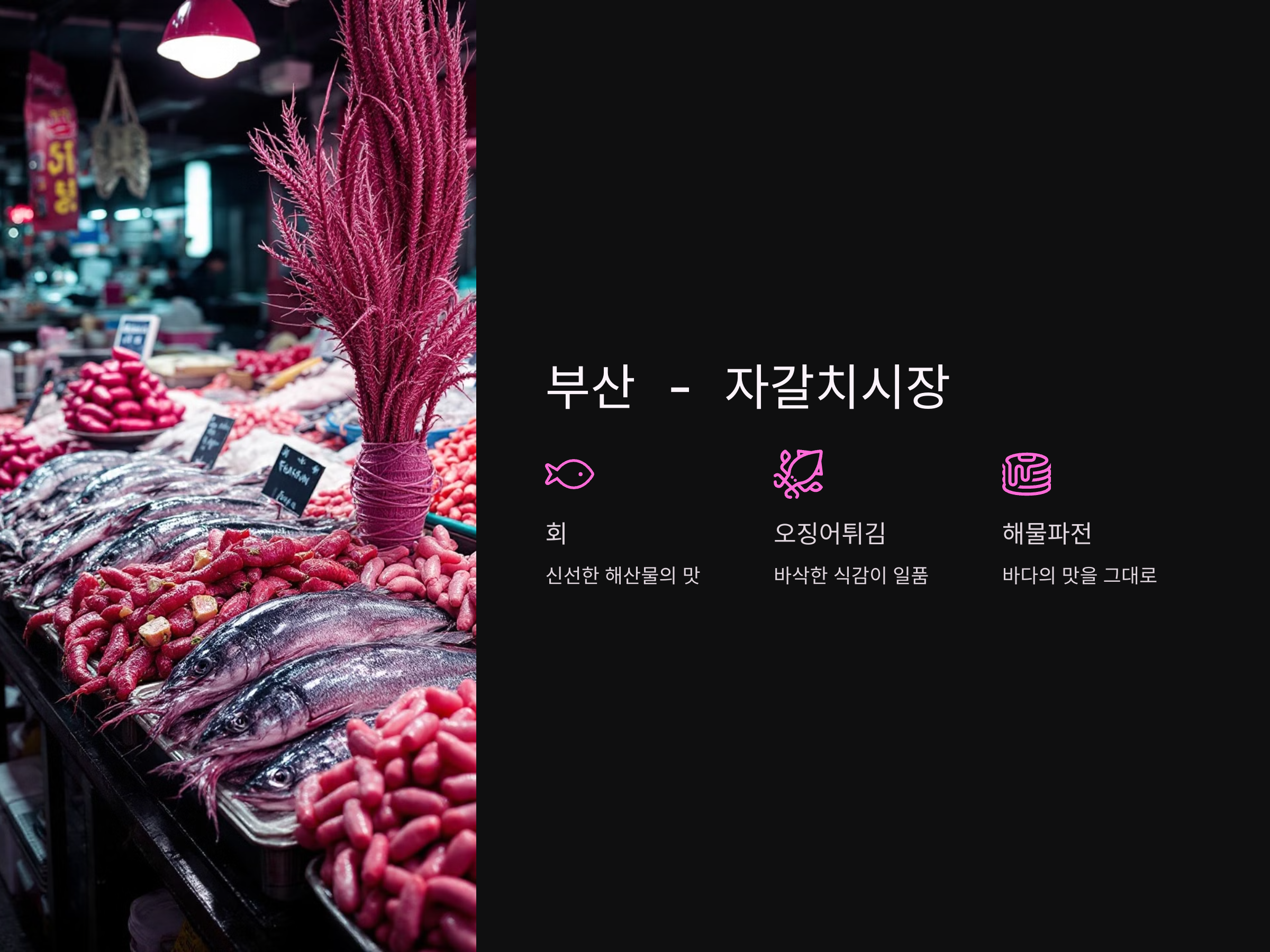- 회: 자갈치시장에서 신선한 회를 맛보지 않으면 부산을 제대로 경험했다고 할 수 없습니다. 각종 해산물과 회를 골라서 맛볼 수 있습니다.