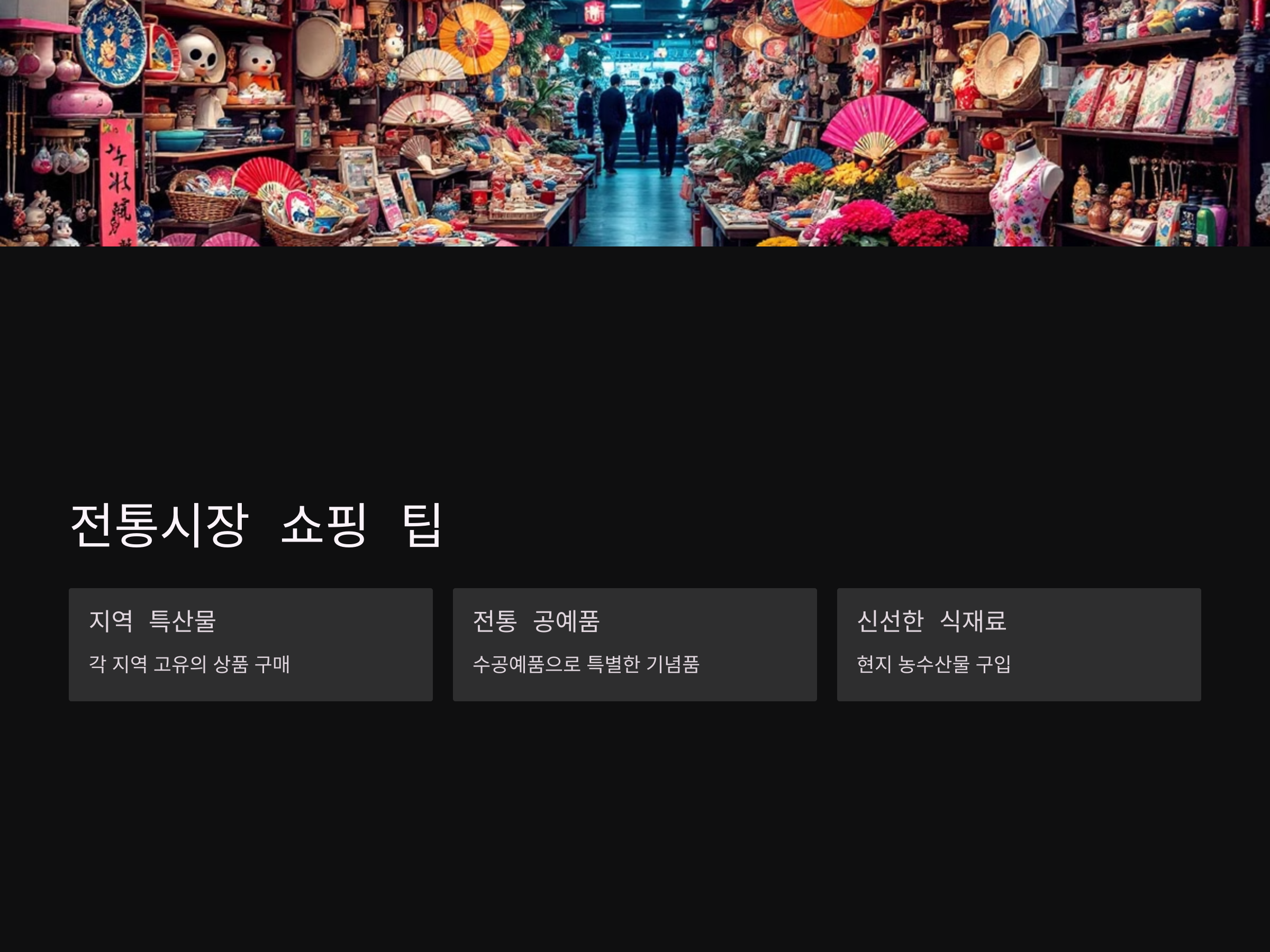 전통시장은 각 지역의 특색을 잘 담고 있는 명소로, 그곳에서 만나는 음식과 문화는 여행의 매력을 한층 더해줍니다. 남대문시장, 자갈치시장, 서문시장, 그리고 남부시장까지, 각 지역의 전통시장마다 고유한 음식과 매력을 가지고 있어, 여행객들에게 특별한 경험을 선사합니다. 전통시장을 방문하면서 그 지역만의 맛과 문화를 만끽하고, 소중한 추억을 만들어보세요.