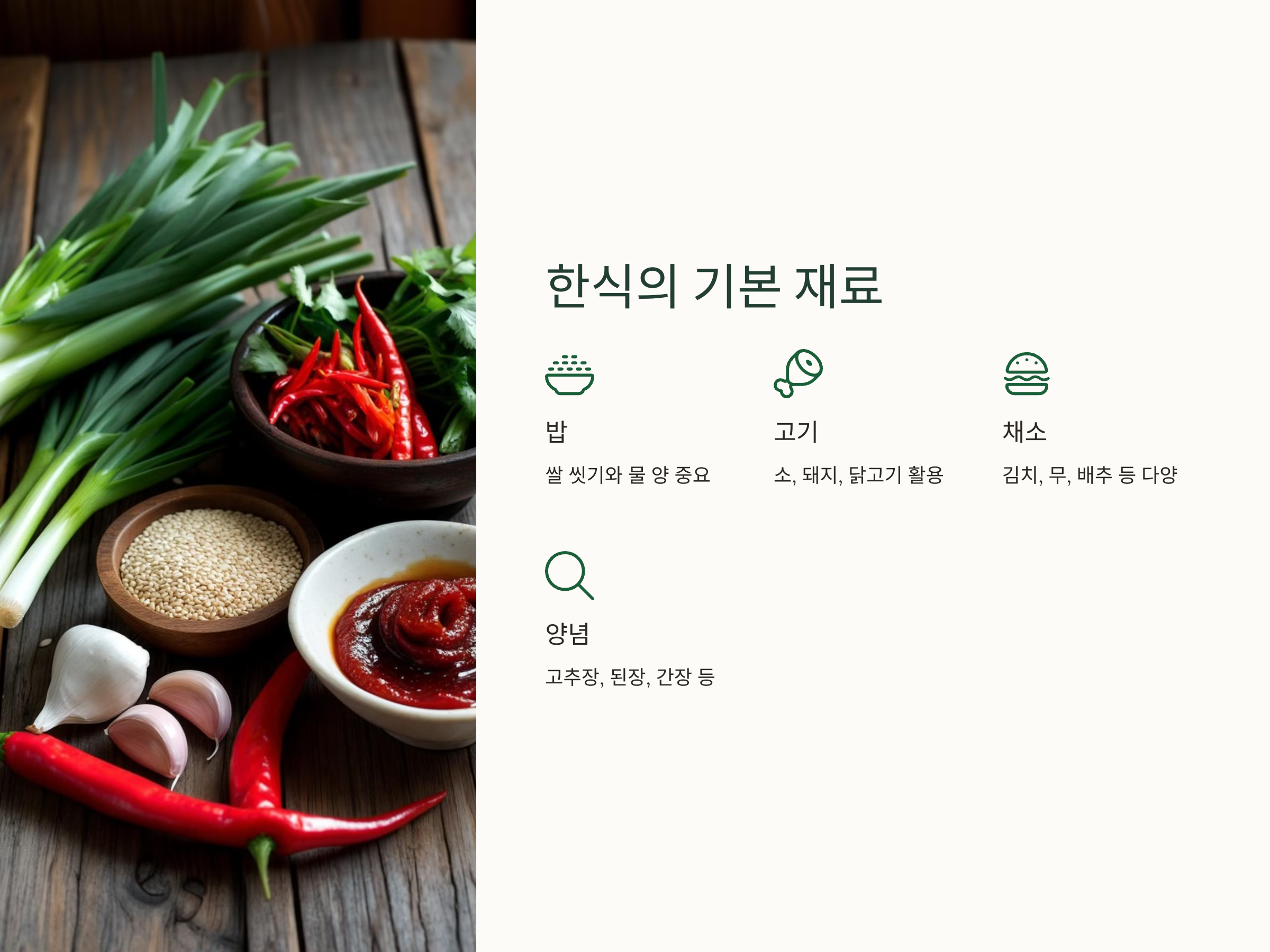 한식을 배울 때 가장 중요한 것은 바로 재료와 조리법입니다. 한식에서 많이 사용되는 기본 재료들을 알아두면, 요리의 기초를 탄탄히 다질 수 있습니다.