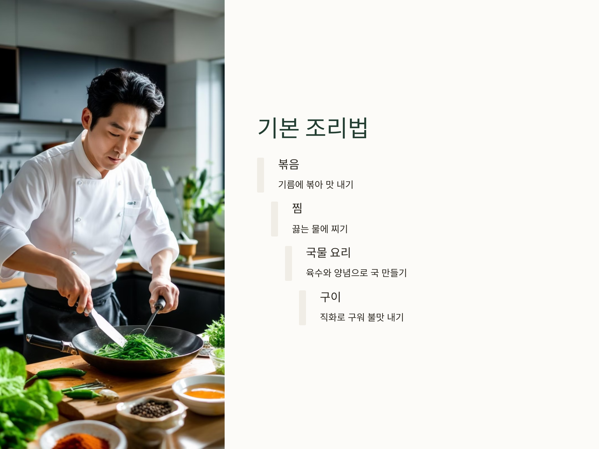 - 국물 요리: 국이나 탕을 만드는 방법입니다. 육수와 양념을 이용하여 다양한 맛의 국물을 만들 수 있습니다.