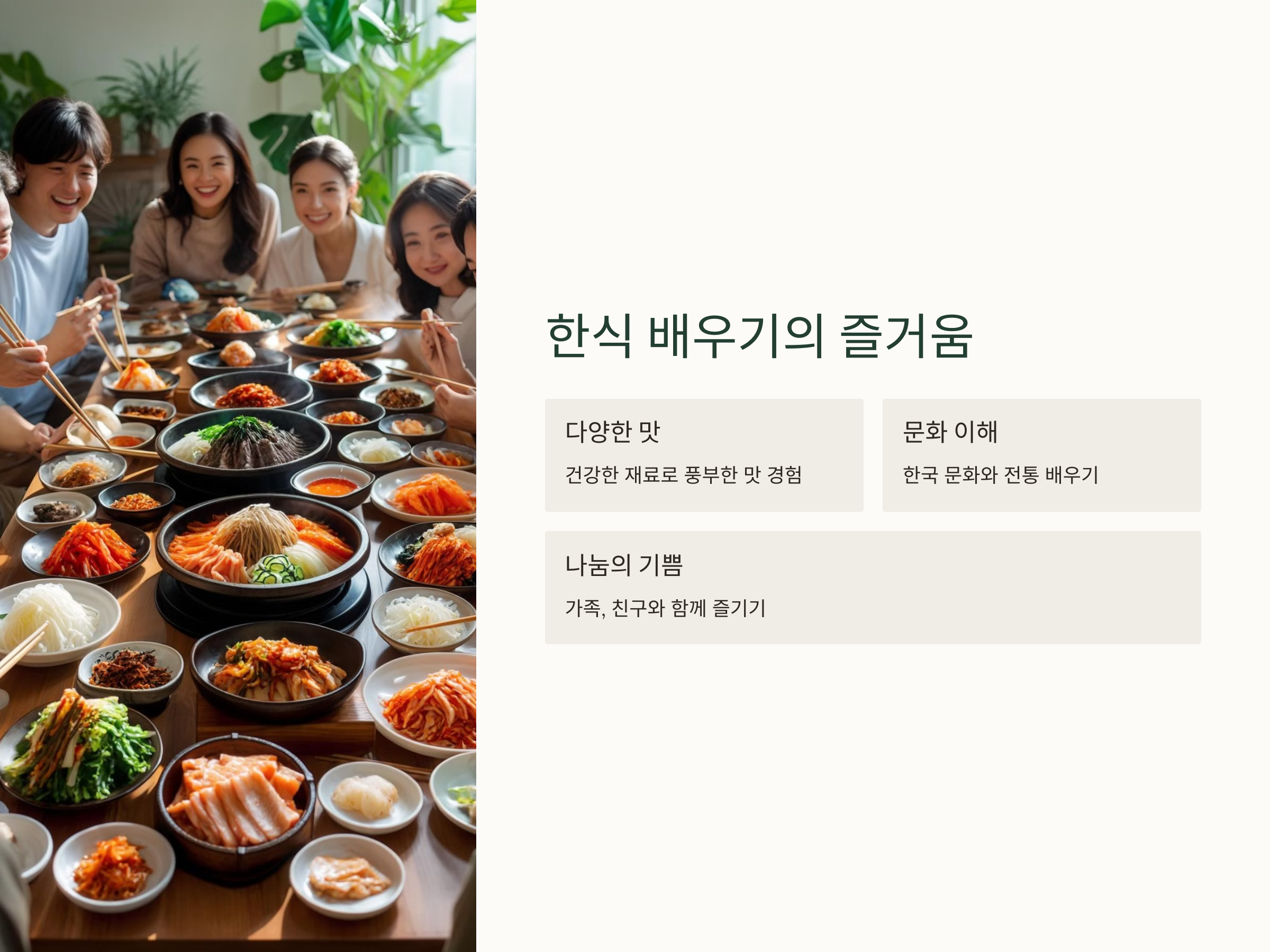 한식은 누구나 쉽게 배울 수 있으며, 익숙해지면 다양한 변형도 시도할 수 있습니다. 전통 한식의 기본을 배우고, 이를 실생활에 적용하여 더욱 맛있고 건강한 요리를 만들어보세요. 한식을 배우는 즐거움은 무엇과도 비교할 수 없을 것입니다!
