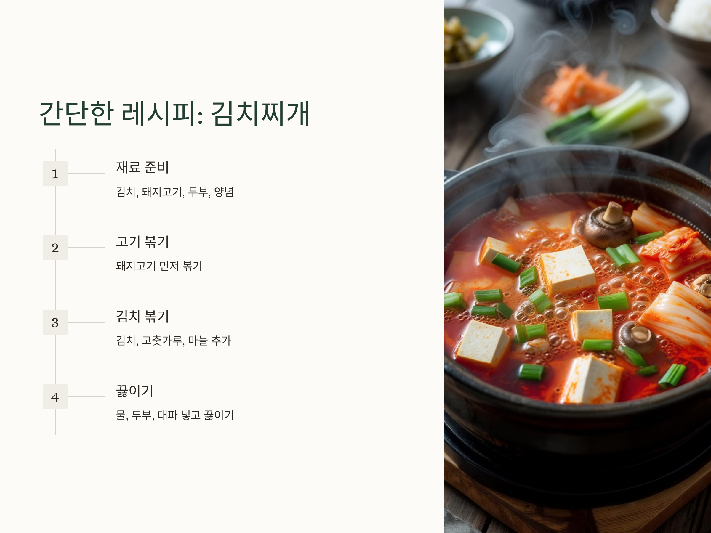 이 김치찌개는 한식에서 가장 인기 있는 국물 요리로, 누구나 쉽게 만들 수 있습니다. 양념만 잘 맞추면 맛있는 김치찌개를 완성할 수 있습니다.