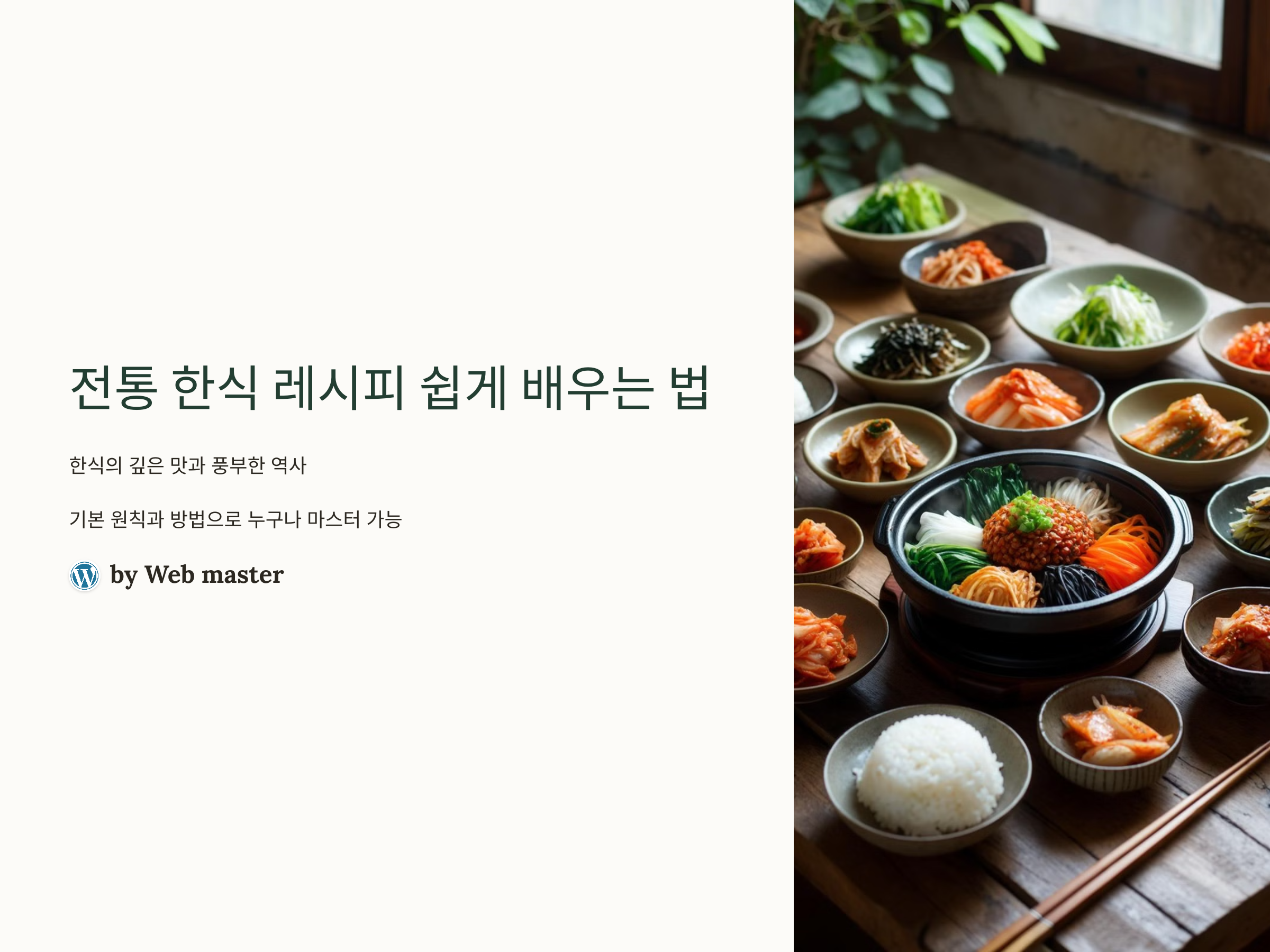 한식은 그 자체로 다양한 맛과 건강한 재료들로 가득 찬 요리입니다. 쉽게 배우는 방법을 통해 한식을 익히고, 이를 가족과 친구들과 함께 나누며 즐기는 것은 큰 보람을 안겨줍니다. 전통 한식을 배우는 데 있어 가장 중요한 것은 기본을 탄탄히 다지고, 꾸준히 실습하는 것입니다. 한식의 세계에 들어가면 그 깊이와 매력에 빠져들게 될 것입니다.