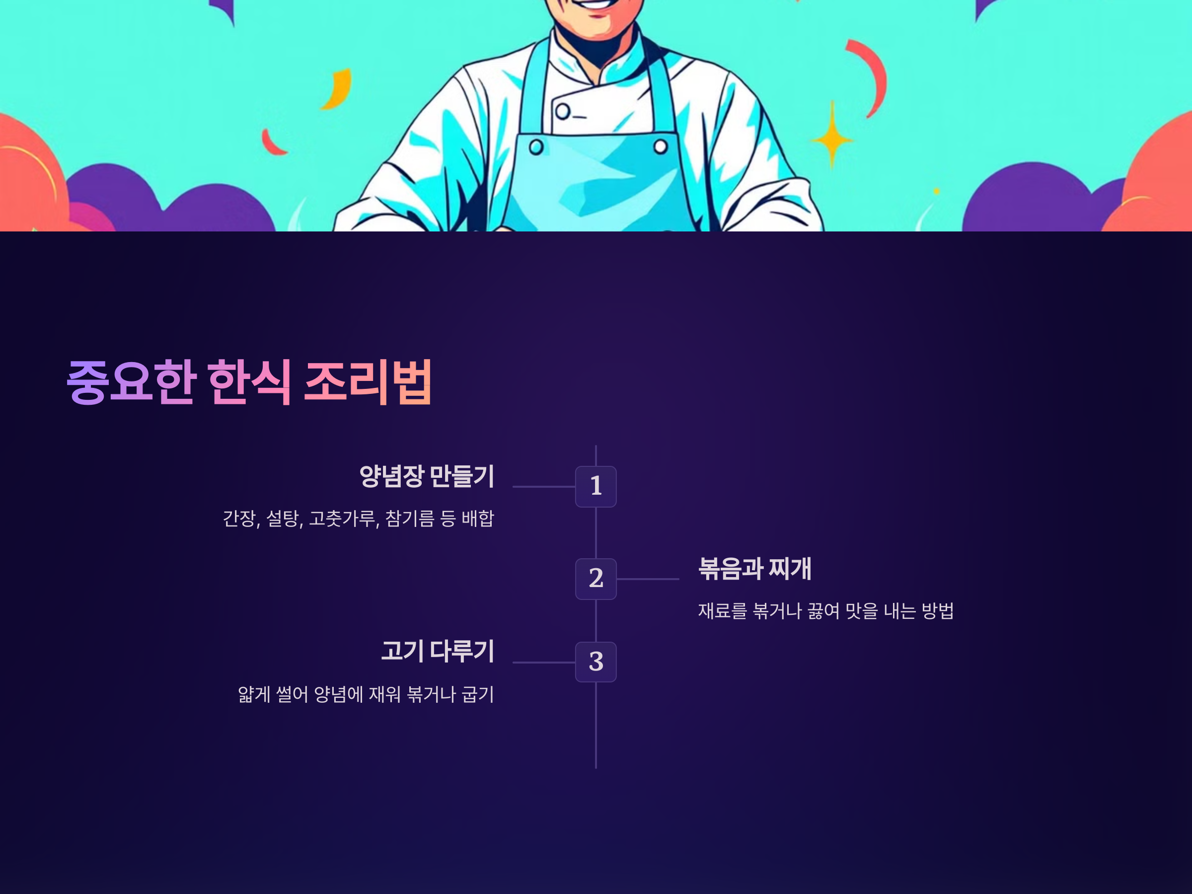 한식에서는 고기를 볶거나 굽는 방법이 중요합니다. 불고기처럼 고기를 얇게 썰어 양념에 재우고, 팬에 볶거나 굽는 방식이 대표적입니다.